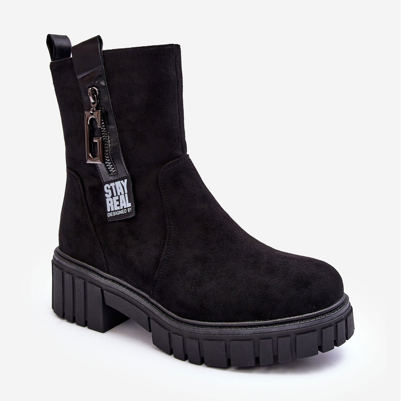 Stilske, crne čizme od ekološke antilop, koje kombiniraju moderan, masivan izgled s udobnošću nošenja. Postavite na čvrstu platformu i ravne potpetice, izolirane pokrivačem obuće - savršene za hladnije jesenske i zimske dane. Pričvršćen praktičnom bravom s unutarnje strane gornjeg dijela, sa zaobljenim nosom za udobnost. Klasičan, uniformirani dizajn funkcionirat će u mnogim svakodnevnim i ležernim stilizacijama.