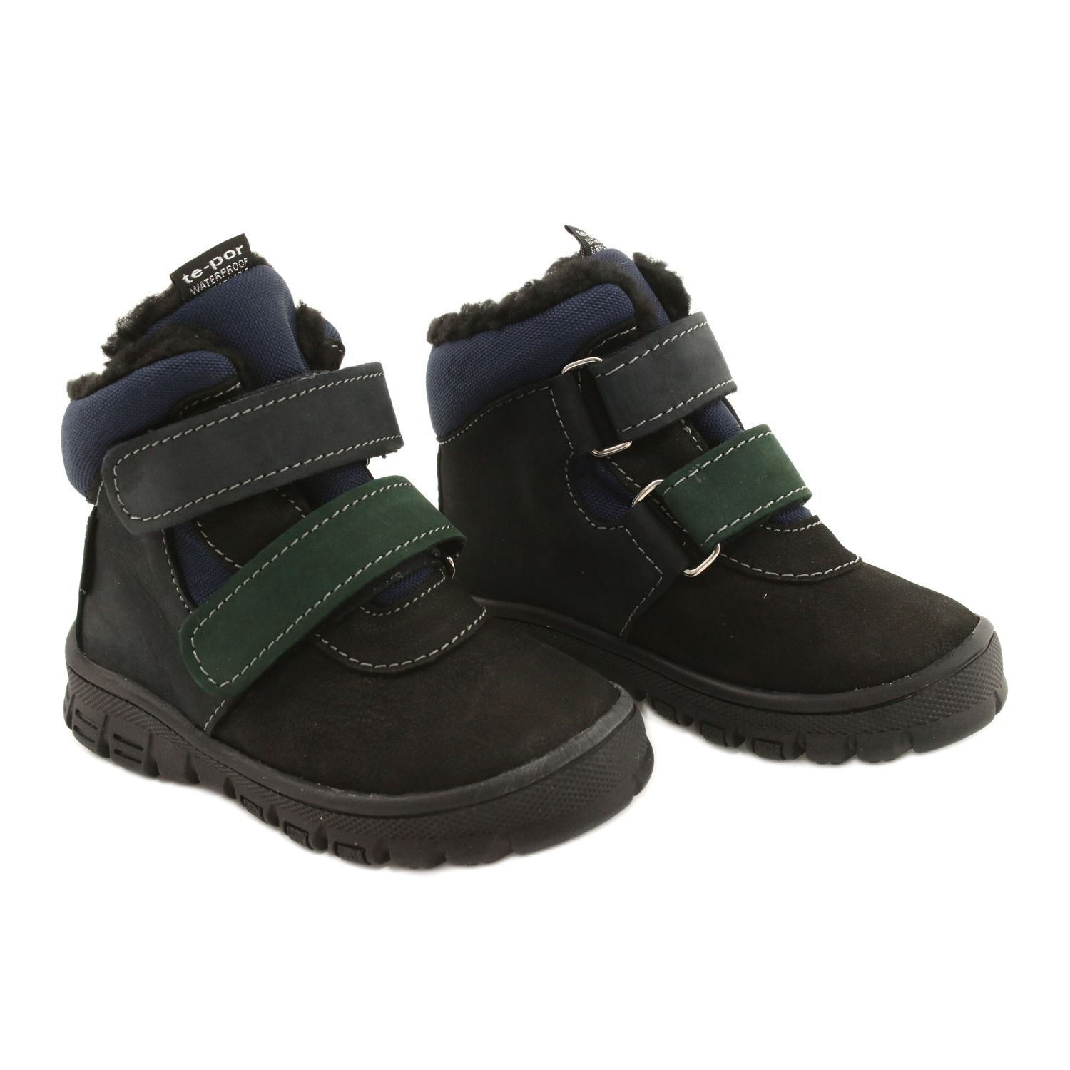 Praktične i čvrste čizme za dječaka, kombinirajući prirodnu kožu s izdržljivim materijalom. Opremljen TE-por (vodootporna) membranom, zahvaljujući kojoj su cipele vodootporne za zimske izlaze i igre vani. Unutrašnjost izolirana s mekim krznom pruža toplinu, a ukočena peta stabilizira i štiti djetetov gležanj.