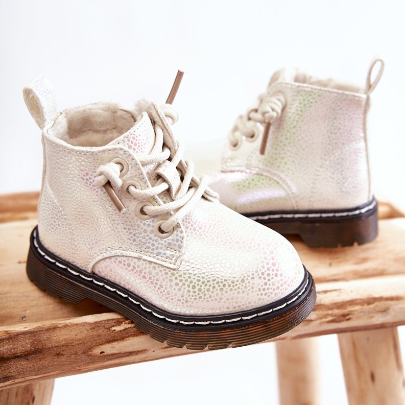 Stilske i praktične čizme za djevojke - izrađene od eko kože sa zanimljivom teksturom, izolirane mekim pokrivačem obuće. Model s vezanje i praktični klizač sa strane, što olakšava stavljanje. Učvršćena peta osigurava stabilizaciju stopala, a ravna peta (2,5 cm) udobnost dok se igra i hoda u hladnijim danima.
