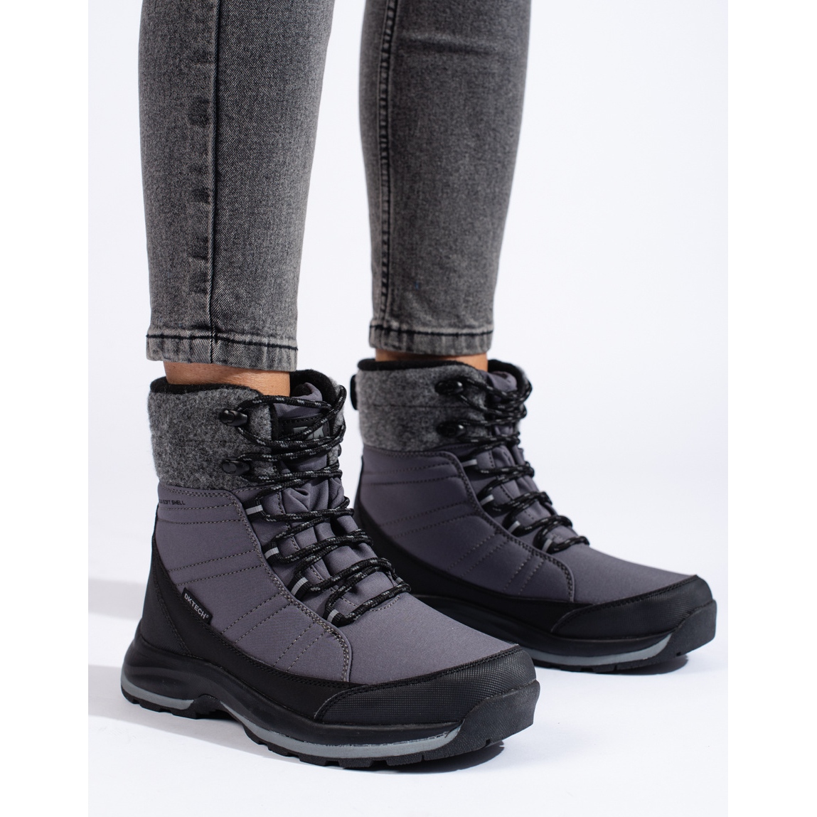 Pojedinosti: DK sive ženske čizme za snijeg na vezanje crna