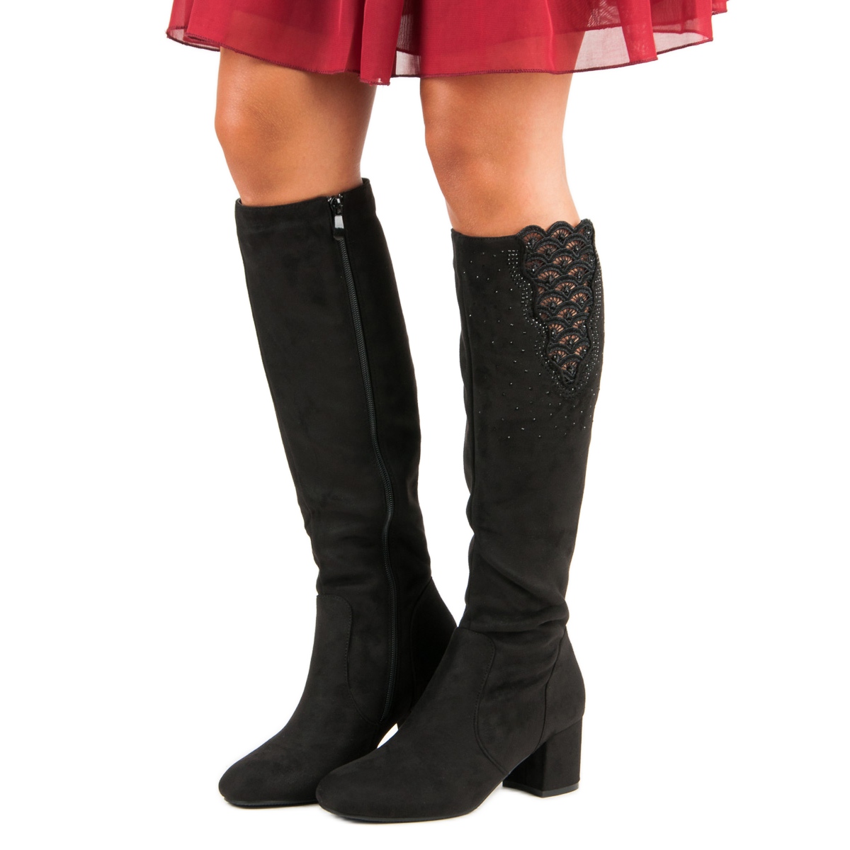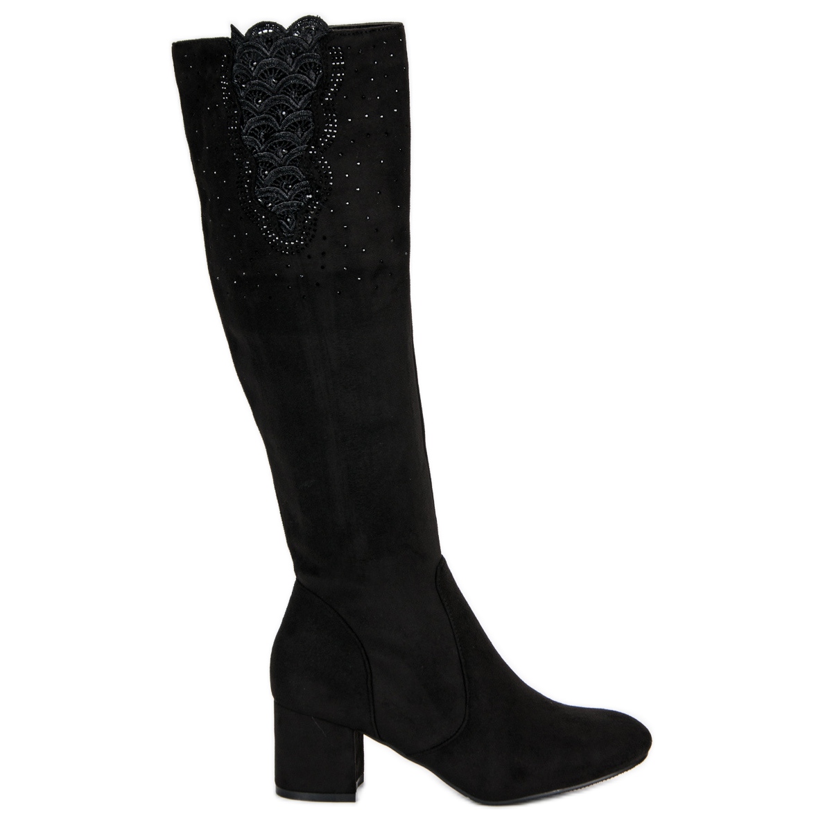 Crne čizme karakterizira lijepo ukrašen gornji dio, koji privlači pažnju suptilnom čipkom na vrhu, upotpunjenom nježnim kristalima. Taj im detalj daje jedinstveni šarm i profinjenost, što ih čini idealnim izborom za posebne prilike za žene koje cijene dobar ukus i moderan stil.
