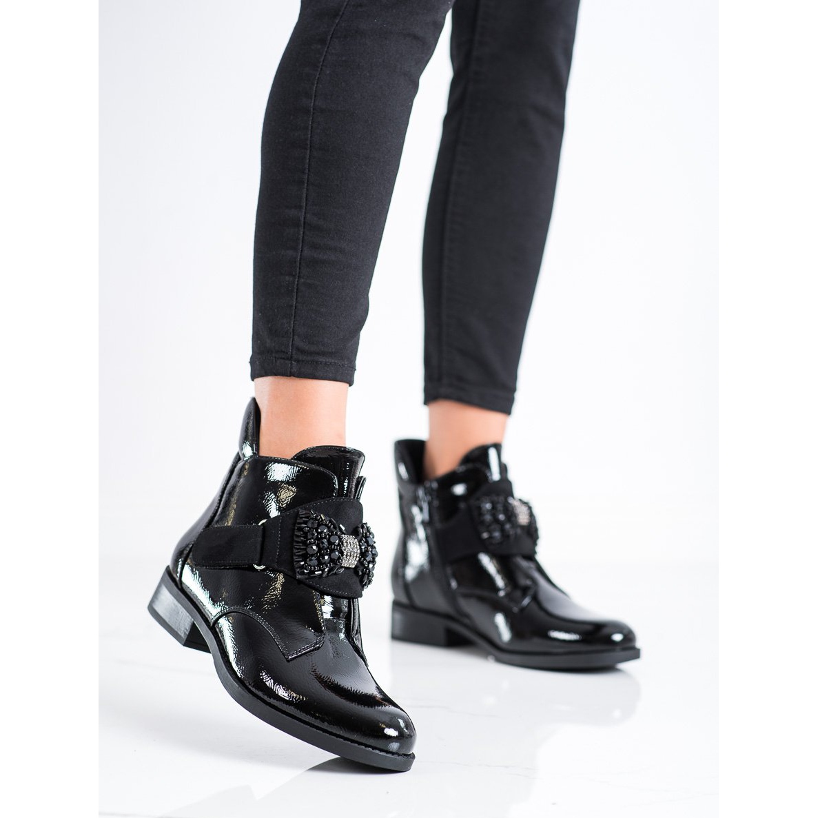 Dodatni elementi, poput šarmantne mašne i kamenčića, daju čizmama jedinstven karakter, a lakirani detalji i kamenčići čine ih jedinstvenima i privlačnima. Okrugli vrh i visina gornjeg dijela do gležnja osiguravaju udobnost i odgovarajuću potporu stopalu.