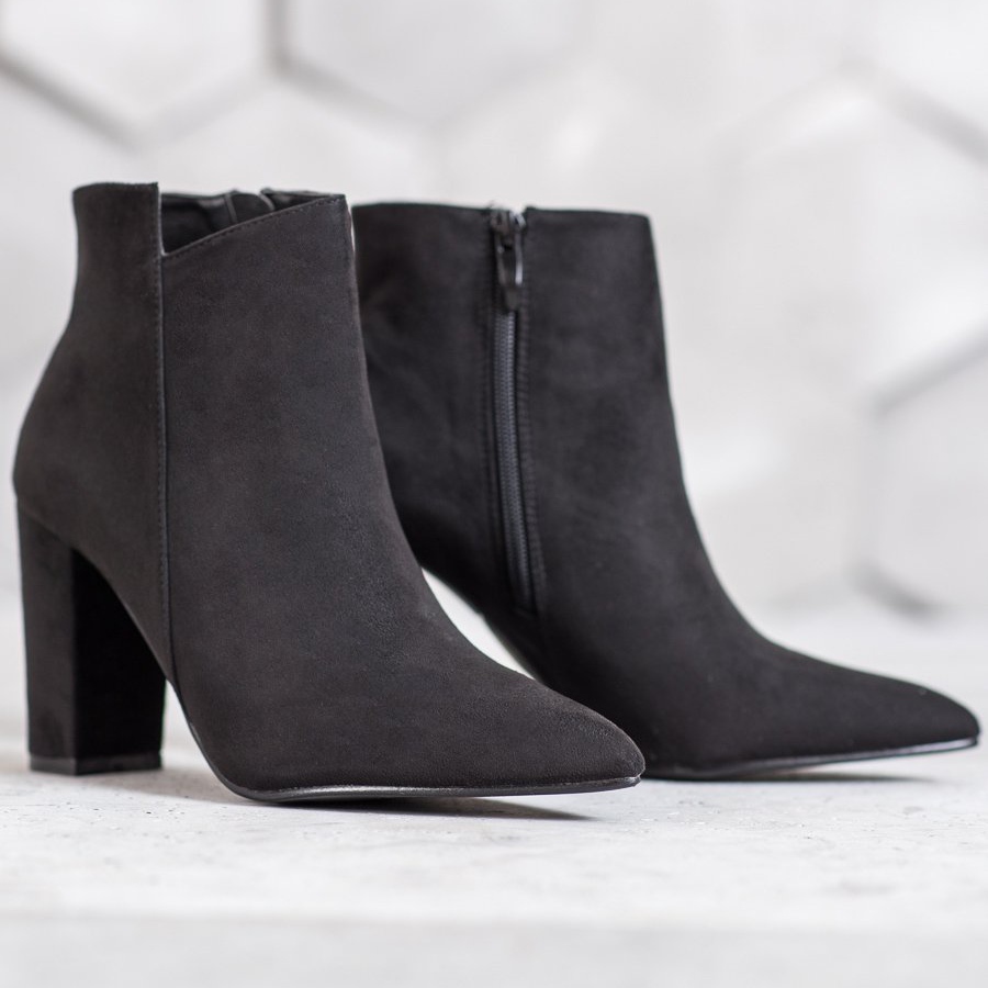 Izrađene od ekološke kože u imitaciji brušene kože, gležnjače u univerzalnoj crnoj boji savršeno će pristajati uz svaki outfit. Visoka blok peta od 9 centimetara ne samo da će optički izdužiti noge, već i osigurati stabilnost i udobnost nošenja. Dodatna prednost je kopčanje na patentni zatvarač koji olakšava obuvanje i izuvanje.
