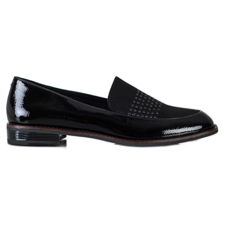 Gornji dio ovih cipela kombinacija je imitacije kože i antilop ekološke kože, što ih čini ne samo elegantnim, već i izdržljivim. Okrugli prsti ukrašeni su suptilnim ukrasom u obliku sitnih točkica, dodajući jedinstveni karakter cjelini. Klasične crne boje čine da ove cipele odgovaraju mnogim stilovima, kako ležernim tako i elegantnijim.