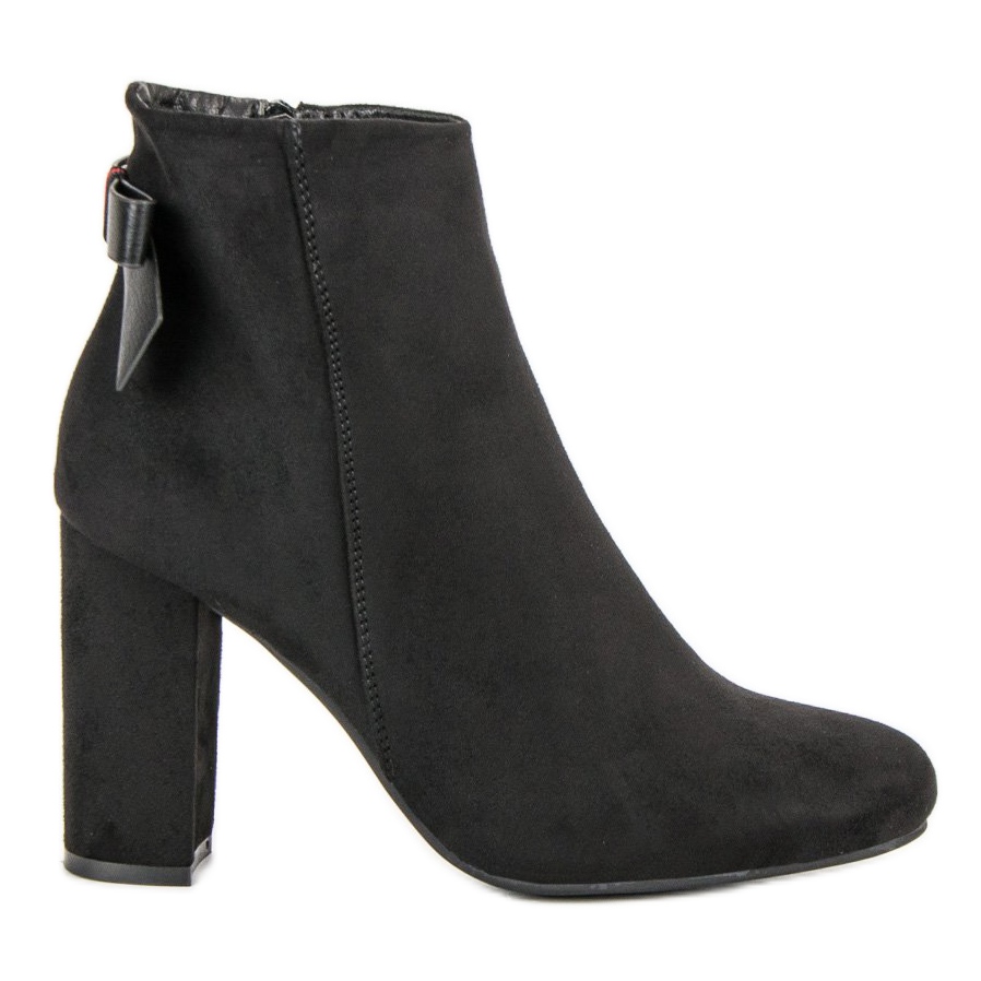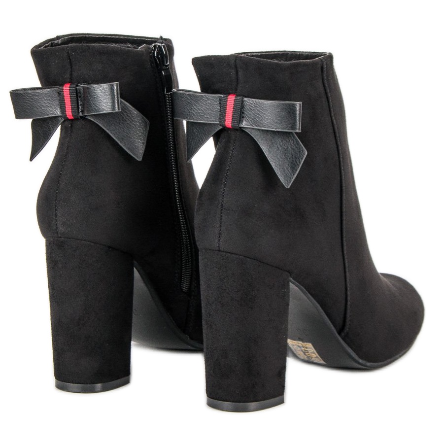 Visoka potpetica u obliku bloka debljine 9,5 cm osigurava stabilnost i udobnost nošenja tijekom cijelog dana. Dodatna prednost je mašna koja ukrašava cipele, što im daje suptilan, ženstven naglasak. Crne gležnjače imaju okrugli vrh što ih čini udobnima i pogodnima za dugo nošenje.