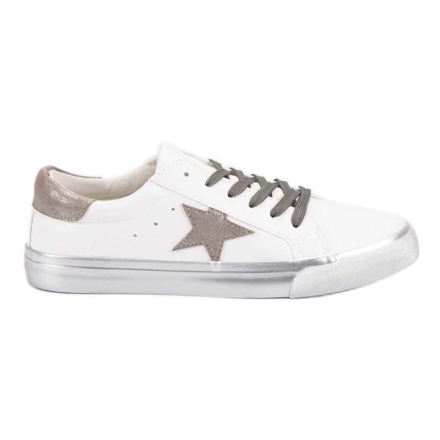 Elegantne niske tenisice, bijele, šarene, savršen su izbor za žene koje žele spojiti udobnost s modernim izgledom. Ove niske tenisice u elegantnoj nijansi bijele s dodatkom srebra pravi su hit u svijetu obuće. Glatki gornji dio ukrašen srebrnom zvijezdom i suptilnim elementom na peti, koji seže do gležnja, daje im jedinstven karakter, ističući ih među ostalim modelima.