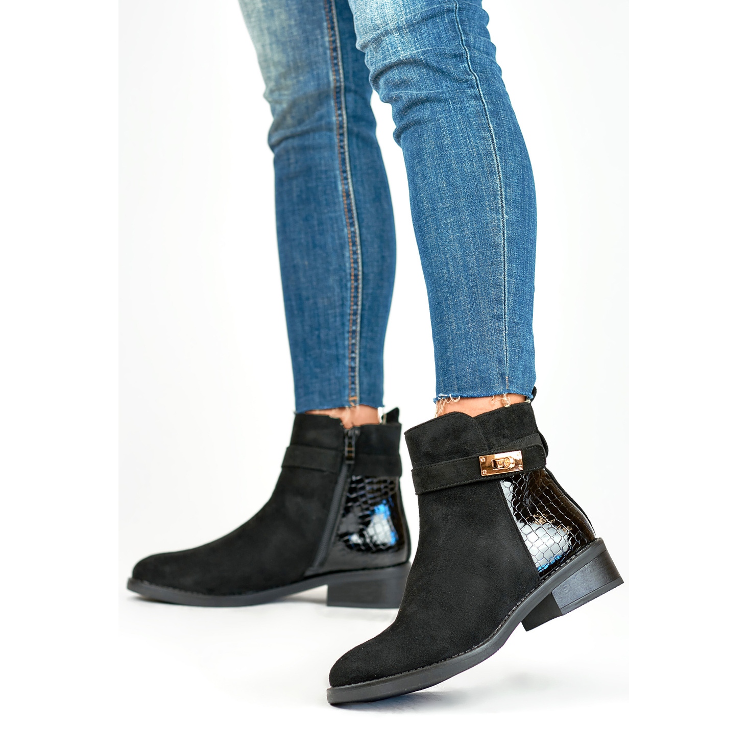 Elegantne ženske čizme na ravnom potplatu - crne, bezvremenske i ugodne. Kombinacija ekološke antilop i lakirane ekološke kože daje im sofisticiran, multi -dimenzionalni izgled: mat gornji gornji kontrasti s suptilnim, sjajnim naglaskom. Delikatni životinjski motiv dodaje karakter, a ne nadvladava cjelinu.