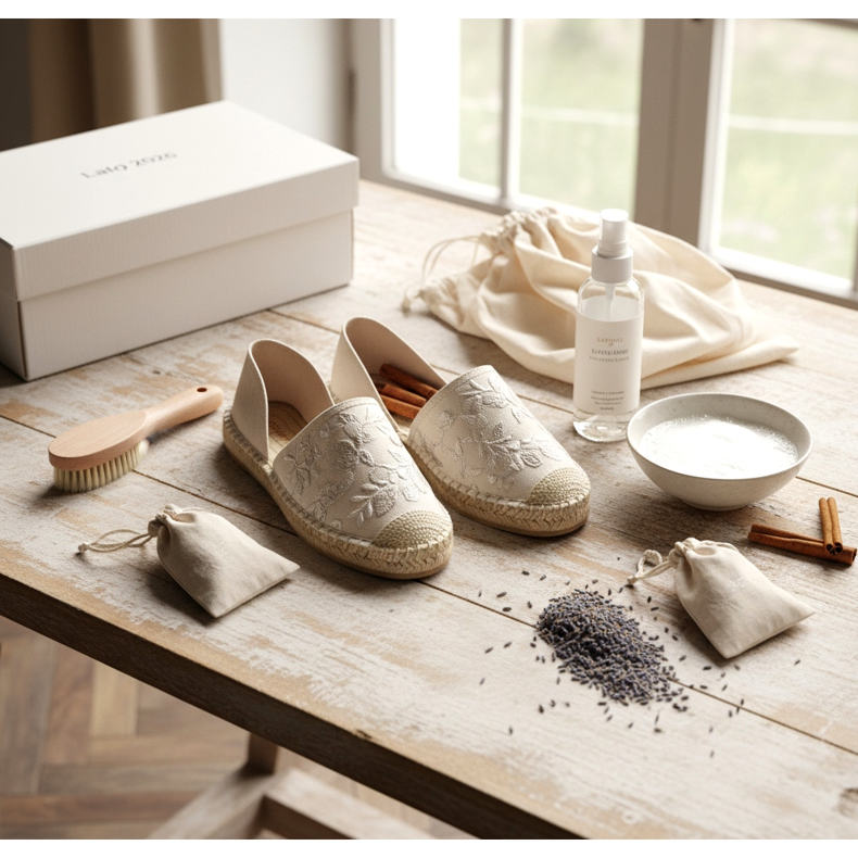 Nakon sezone svoje espadrile spremite na suho mjesto, najbolje u kutiju ili pamučnu vrećicu. Možete ih napuniti vrećicama lavande ili cimeta koji djeluju osvježavajuće i prirodno. Potplat od jute ne smije se sušiti u blizini radijatora - može se raspasti.