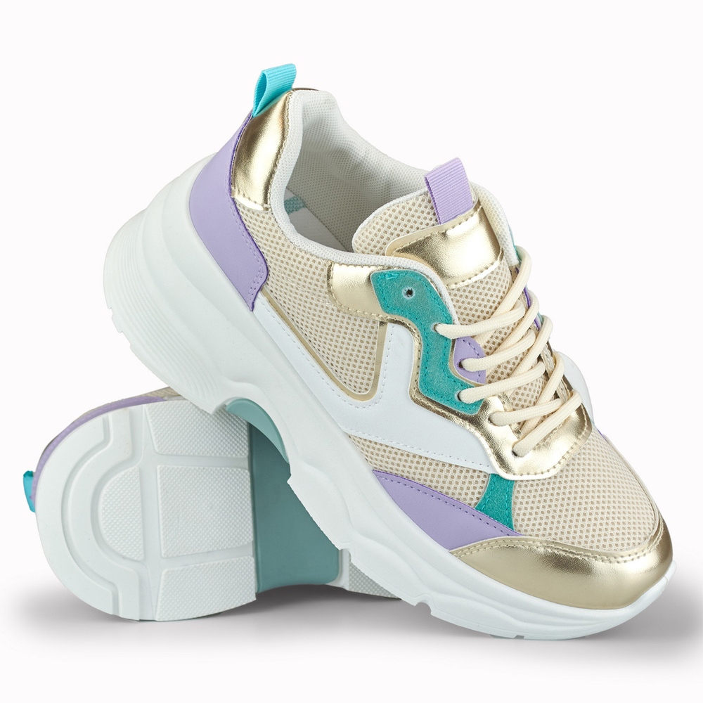 Moderne i udobne tenisice Geori iz drugog branda koji kombiniraju moderan, višestruki dizajn sa zlatnim naglascima. Gornja izrađena od ekološke kože i tekstilnih materijala i 6 cm platforme dodaju samopouzdanje i naglašavaju lik, održavajući udobnost tijekom dana. Savršeno za proljetnu/ljetnu sezonu - za urbane stililizacije, za šetnju i povremene rezultate.