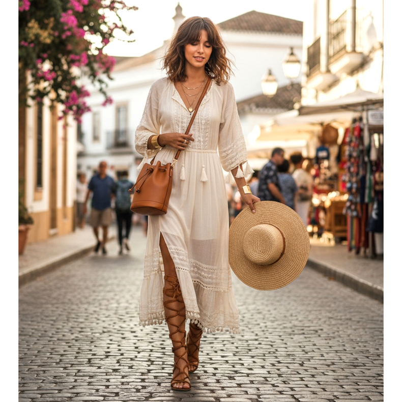 Prozračna haljina u boho stilu s vezom ili resicama prirodno se slaže s kožnom estetikom gladijatorica. Uz haljinu u nijansama ekru, terakote ili zagasito zelene odaberite sandale boje konjaka ili prirodno smeđe. Ovaj set funkcionira i na plaži i na ljetnim sajmovima ili vernissages.