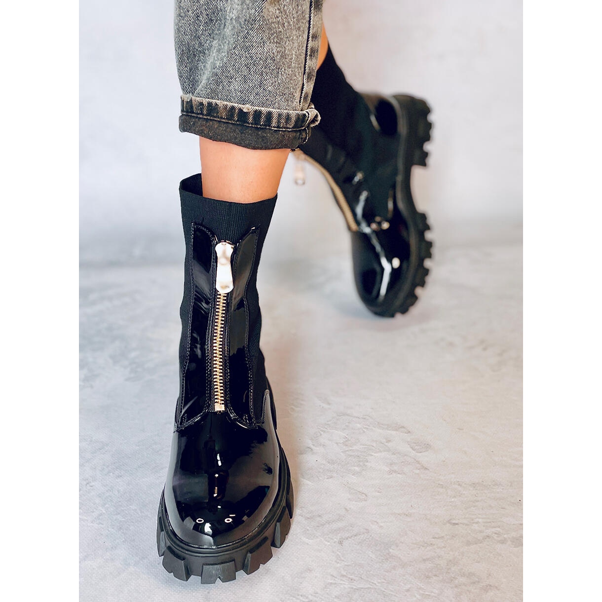 Crna boja s lakiranom završnom obradom naglašava njihov ekstravagantni karakter, a ukrasni patentni zatvarač na prednjici daje im vojnički, ali ujedno i ženstveni naglasak. Visok potplat debljine 5,5 cm ne samo da dodaje visinu, već osigurava i udobnost tijekom svakodnevnih aktivnosti. Zahvaljujući zaobljenom prstu i ravnoj peti, ove radne hlače jamče udobnost tijekom cijelog dana.