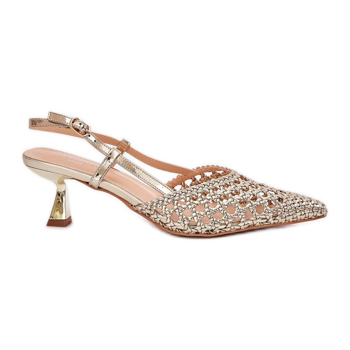 Predstavljamo elegantne visoke potpetice s šiljastim nosom i otvorenom petom u fenomenalnoj zlatnoj boji, koja će se savršeno nadopuniti svake večeri stilizacija. Ovaj jedinstveni model, pričvršćen kopčom, pruža savršeno uklapanje u stopalo, što jamči ne samo udobnost, već i samopouzdanje na svakom koraku.