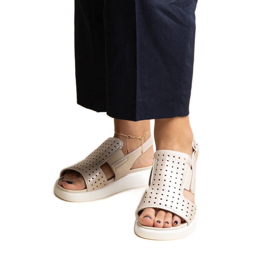 Sandale su dostupne u zlatu, što se dobro uklapa u ljetne trendove, savršeno podudarajući i povremene i elegantnije stilizacije. Bijeli plastični potplat osigurava izdržljivost, a guma koja se koristi u umetu jamči udobnost nošenja.