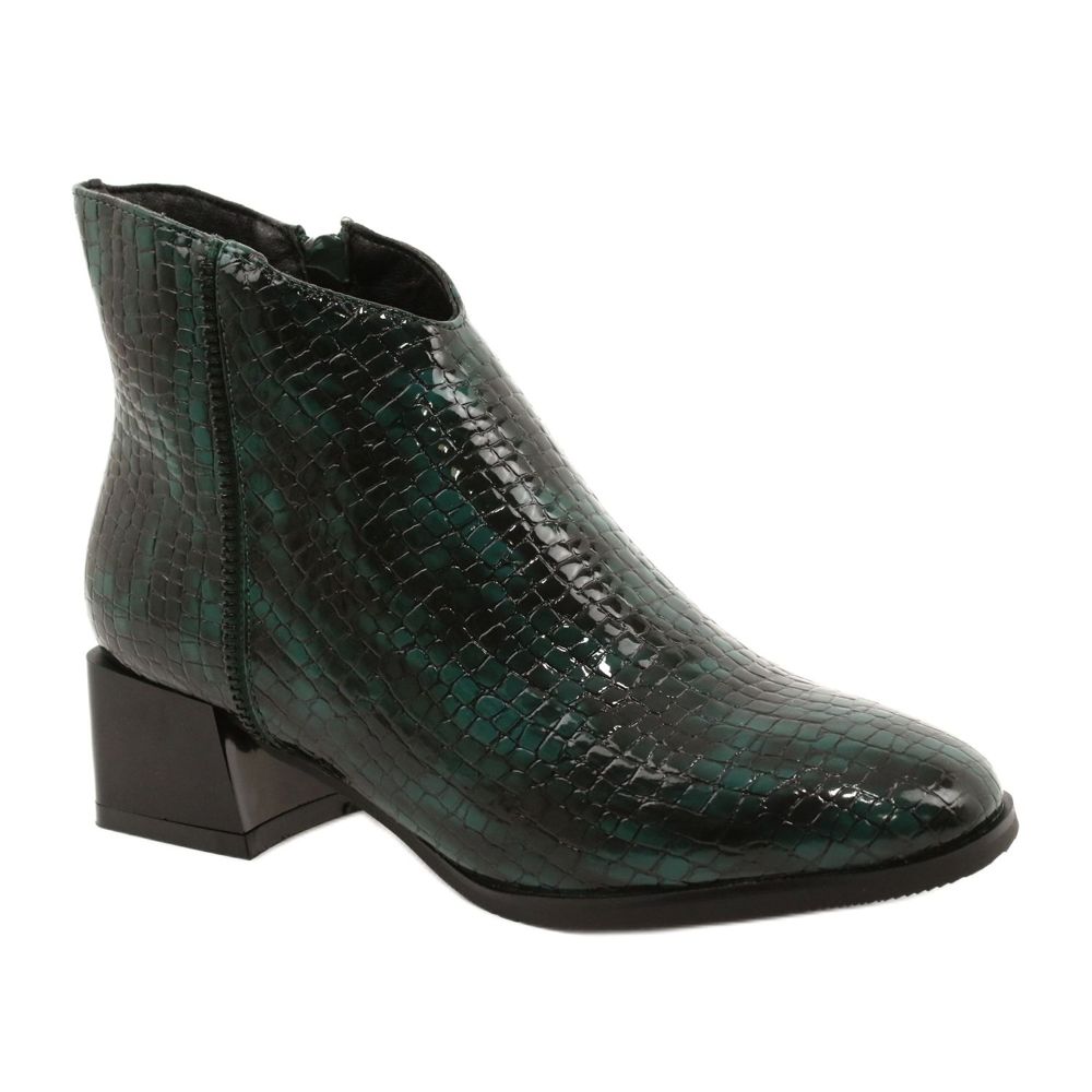 M. Daszyński MR2130-8 "Zeleni" -polirane ženske čizme koje kombiniraju udobnost s modernim naglaskom. Izrađene od ekološke kože s lagano lakiranim završetkom, s jasnom motivom životinje u nijansi zelene i crne, oni su originalni dodatak povremenim stilu. Delikatni ukras u obliku vidljive brave daje cipelama moderan karakter.