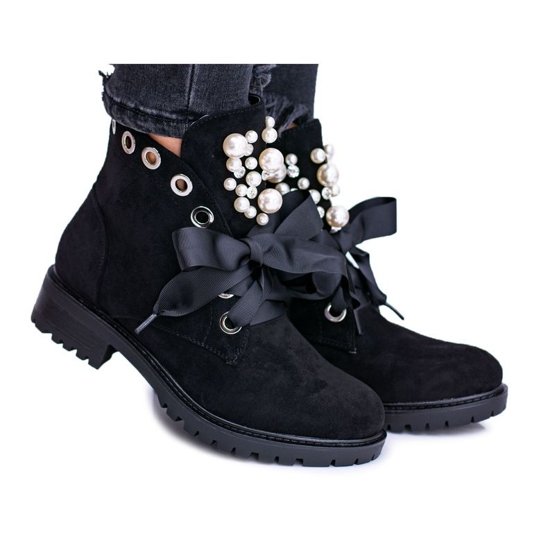 Pojedinosti: Izolirane čizme od brušene kože s biserima i vrpcom, crna Perla