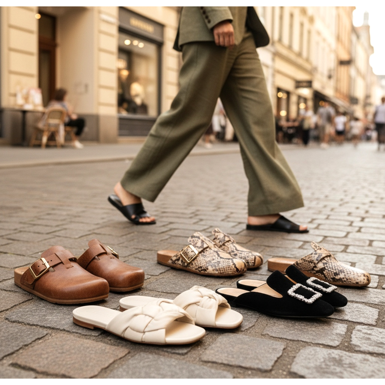 Mule u sezoni 2026. prije svega su profinjeni. Modeli od prirodne kože ili antilopa, u bež, konjak, crnoj ili boca zelenoj boji - to su cipele koje izgledaju sjajno i u uredu i na odmoru u gradu.