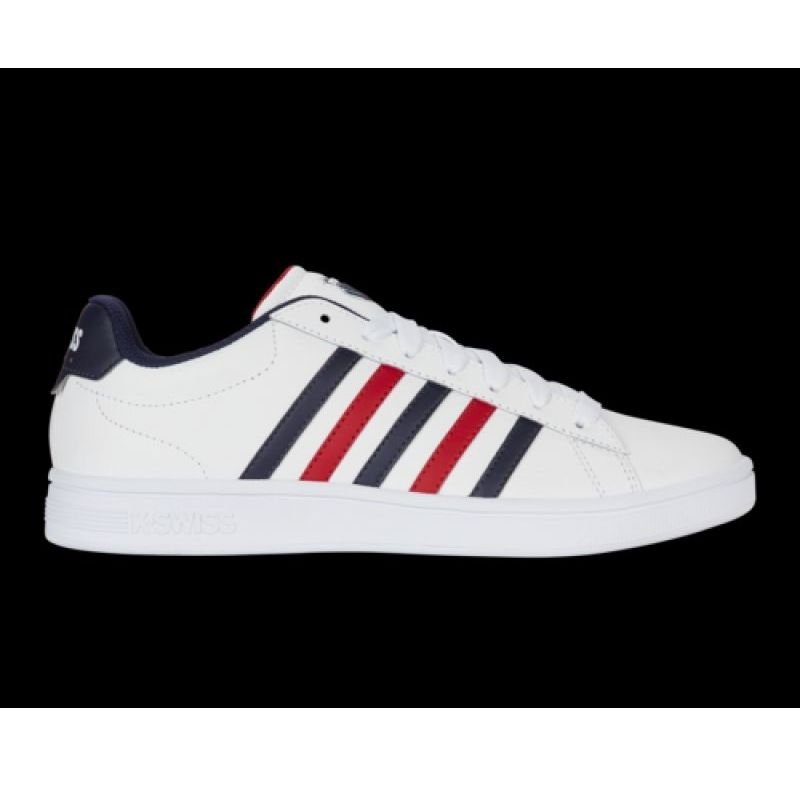 K-SWISS Court Tiebreak II M 04413-983-M cipele su savršena kombinacija sportske funkcionalnosti s elegantnim stilom. Izrađene od sintetičke kože visoke kvalitete, nude trajnost i jednostavnost čišćenja, što ih čini savršenim izborom i za svakodnevnu upotrebu i za aktivan dan. Njihov klasični, bijeli izgled s kontrastnim dodirima u mornarsko plavom i crvenom dodaju lik i čini da se ovaj model izdvaja od ostalih.