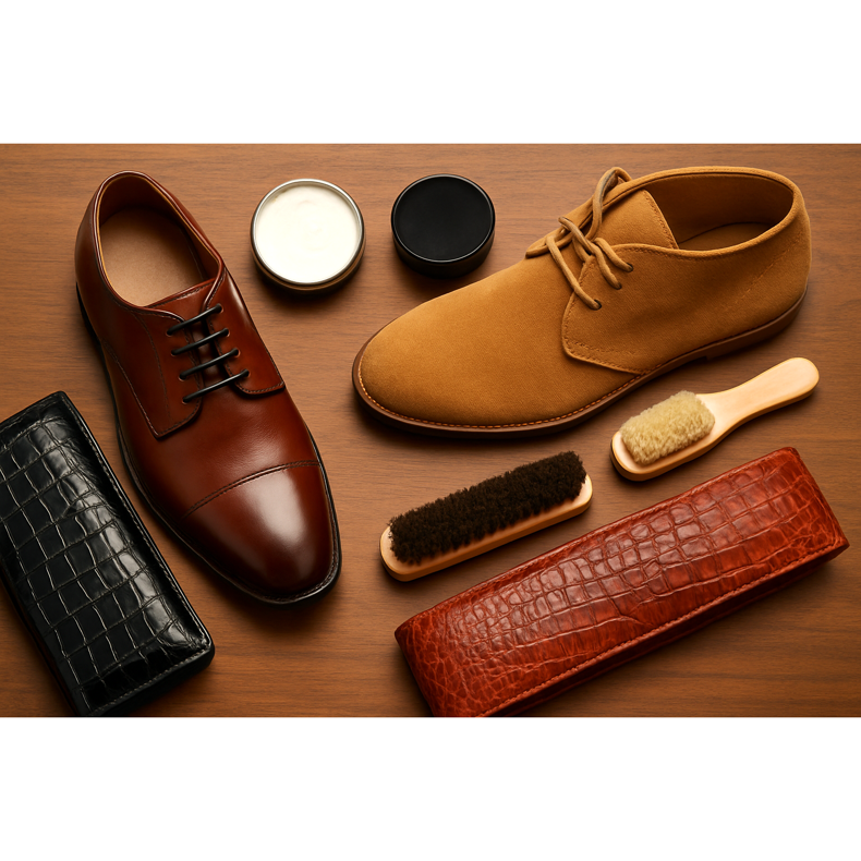 Glatka (zrna) koža: Standardna briga o kremama i pastama, može se polirati za sjaj. Suede i Nubuk: Samo posebne četke i pripreme, nikad ne koristite standardne kreme, redovito četkajte „ispod kose“. Oslikana koža: osjetljivi rezovi blago navlaženi, posebni pripravci, izbjegavajte voska. Prešana koža (kopile): Posebno oprezno prilikom čišćenja, vrhnje lagano zalijepite, ne pritisnite čvrsto na uzorak. Egzotična koža (zmija, krokodil): specijalizirane pripravke, rjeđi stvaranje, oprez s vodom. Uljna koža (izvlačenje): minimalna skrb, sama 'tretira' dok nosite.