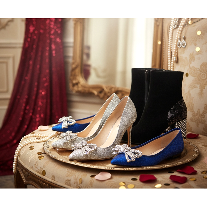 Doček Nove godine je vrijeme bljeska i glamura. Možete si priuštiti i hrabrije odabire - svjetlucave štikle, cipele sa sjajnim aplikacijama ili metalik sandale. Ovo je jedna noć u godini kada je sijanje ne samo dopušteno, već i preporučljivo. Planirate li se intenzivno igrati do jutra, uzmite rezervne, udobnije cipele.