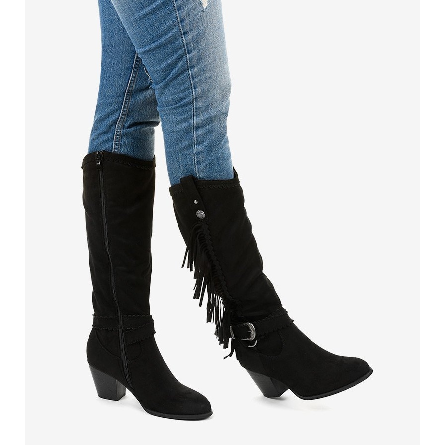 Predstavljamo crne Kellyn kaubojske čizme od brušene kože, koje savršeno pristaju uz moderan boho stil i mnoge druge stilove. Zahvaljujući impresivnom gornjištu ukrašenom nježnim resicama, remenu s ugraviranom kopčom i retro nitnama, ove cipele postaju jedinstven element svakog ormara.