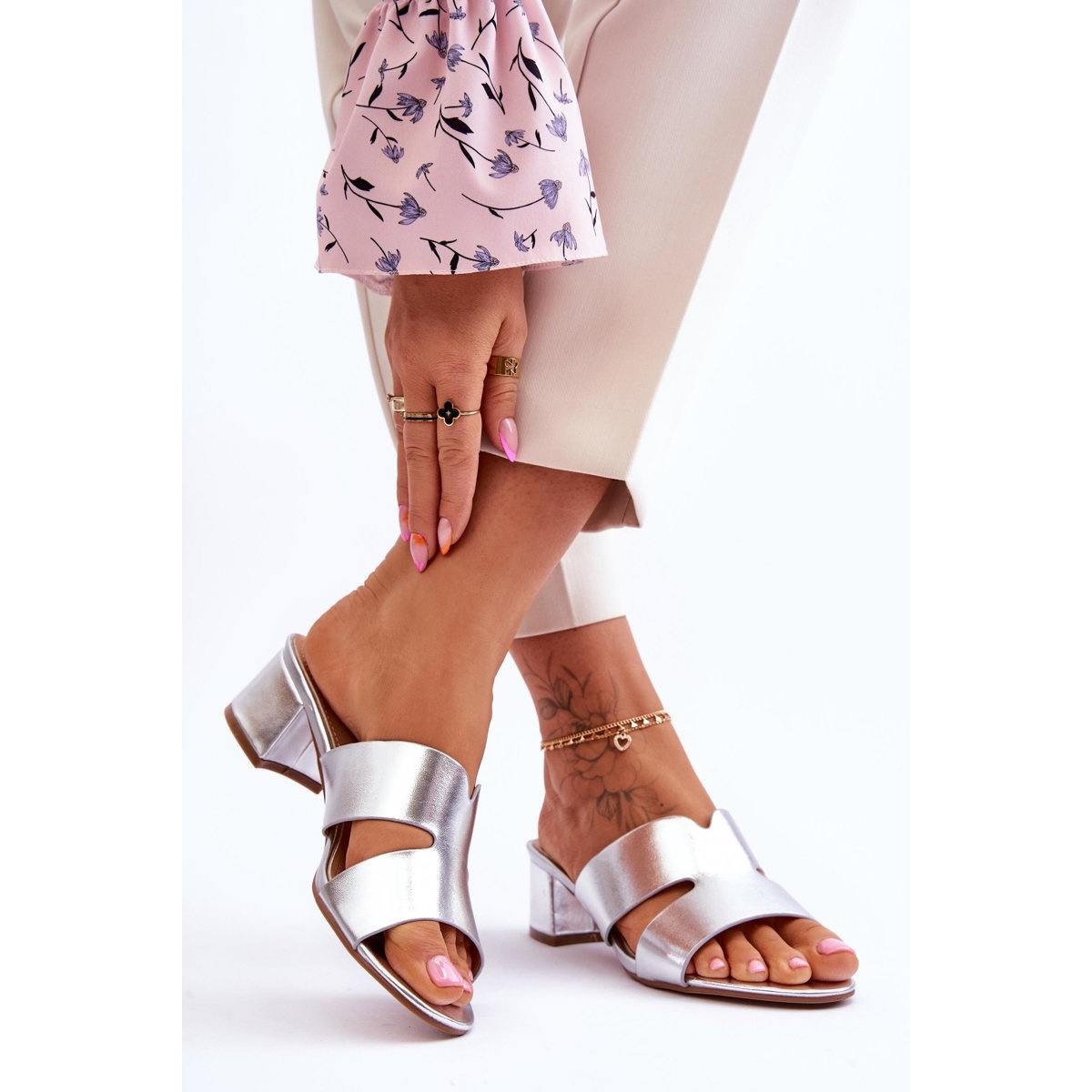 Inna marka Klasične srebrne Miley kožne papuče na nisku petu srebro
