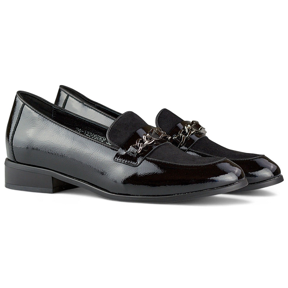 Predstavljamo lakirane crne klasične ženske cipele, koje su idealna kombinacija elegancije i udobnosti. Napravljene od strane ugledne marke, ovi su loaferi savršeni za mnoge stilove - od ležernijih do formalnijih.