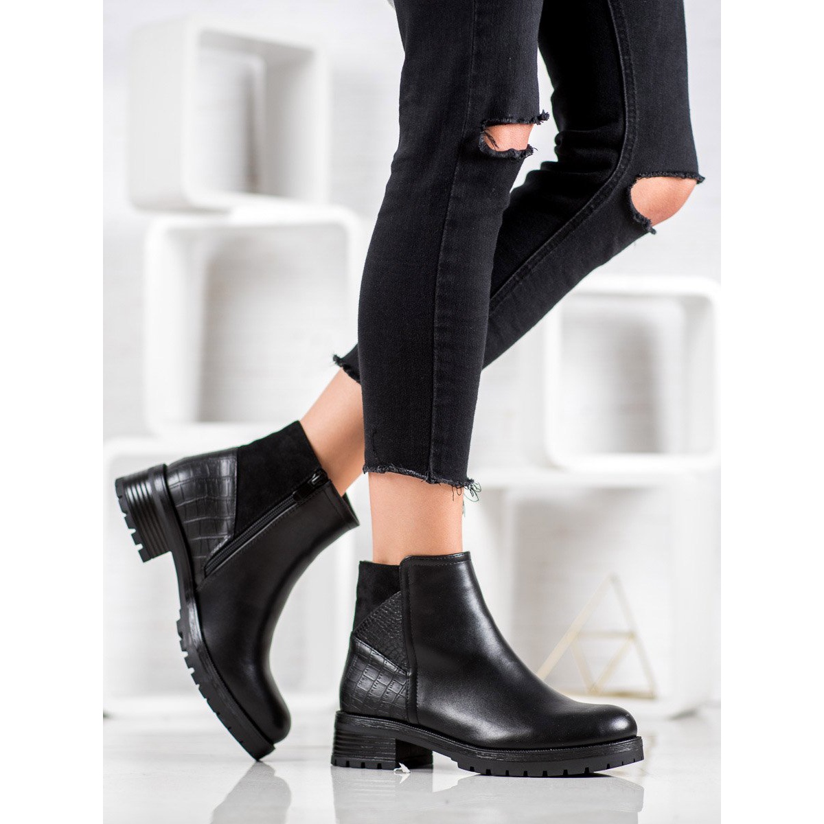 Gornji materijal je kombinacija imitacije kože (50%) i imitacije antilop kože (50%), što čini cipele ne samo elegantnim, već i otpornim na vremenske uvjete. Tekstilna unutrašnjost i izolacija osiguravaju toplinsku udobnost čak iu najhladnijim danima.