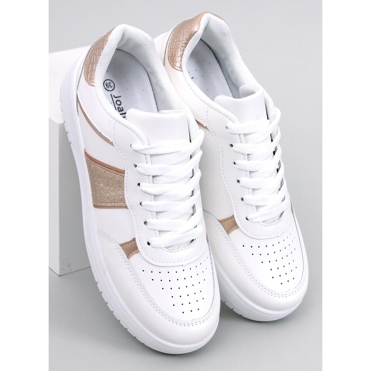 Upečatljive bijele tenisice ukrašene su suptilnim zlatnim metalik detaljima. Jedinstveno reljefno utiskivanje čini cipele ne samo funkcionalnim, već i modernim dodatkom koji će nadopuniti svaki casual ili još sofisticiraniji stajling.