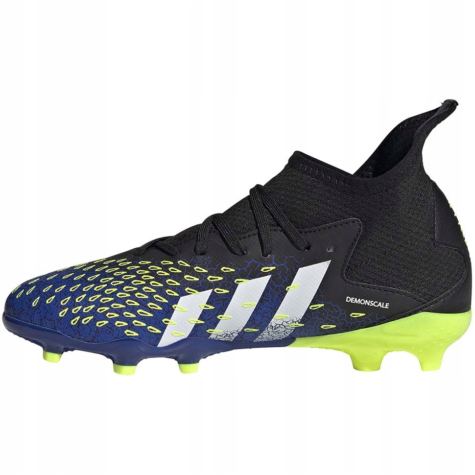 Adidas Predator Freak.3 FG Junior (FY0613) Nogometne cipele - Idealno za mlade igrače koji žele povećati preciznost i kontrolu lopte na prirodnoj površini. Model kombinira pletenicu, tekstilnu gornju sa sintetičkim elementima i konveksnim demonskalnim zonama koje poboljšavaju prianjanje lopte prilikom prolaska, trčanja i snimaka. Crne, elegantne boje dopunjene su izražajnim žutim i plavim naglascima, koji naglašavaju sportsku prirodu cipela.
