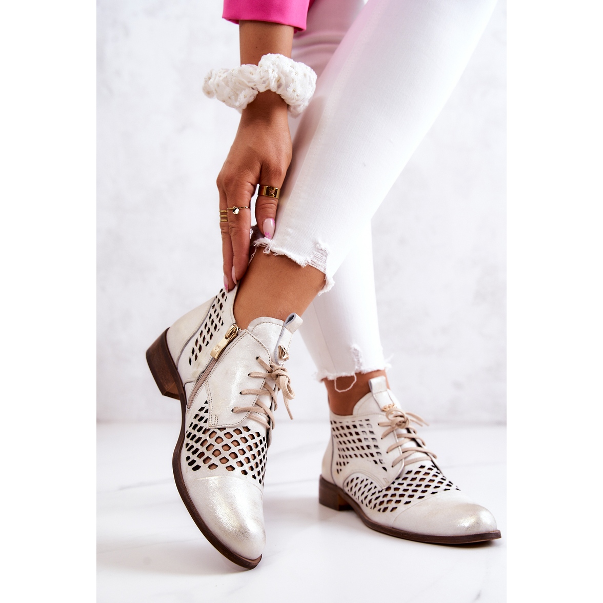 Detalji: Kožne ažurne čizme Nicole 2704/004 Bijela i zlatna