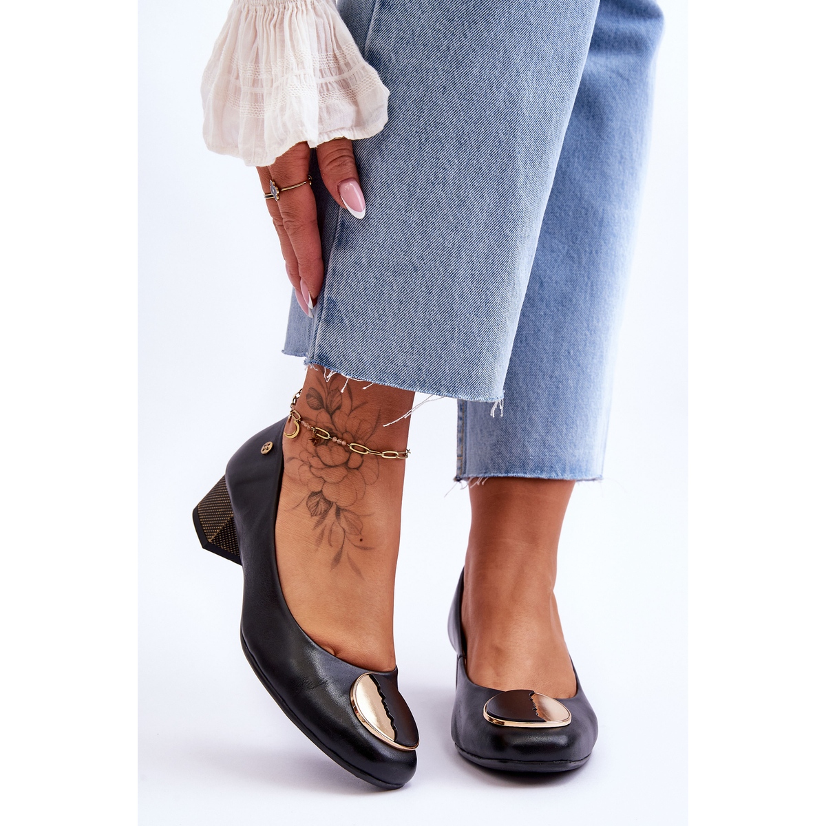 Potpetica visoka 4 cm u obliku bloka čini cipele stabilnima, a istovremeno dodaje eleganciju. Ovaj model dostupan je u različitim veličinama, što svakoj ženi omogućuje da pronađe savršen kroj. Glatki crni potplat od gume osigurava odgovarajuće prianjanje, što povećava udobnost korištenja na različitim podlogama.