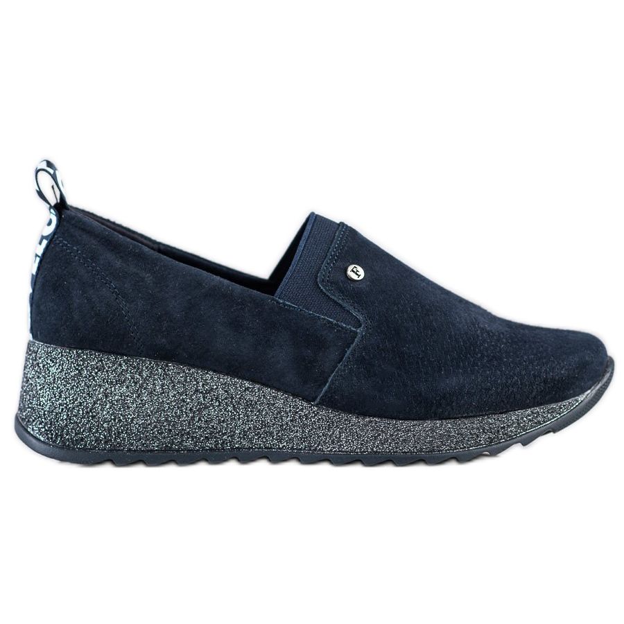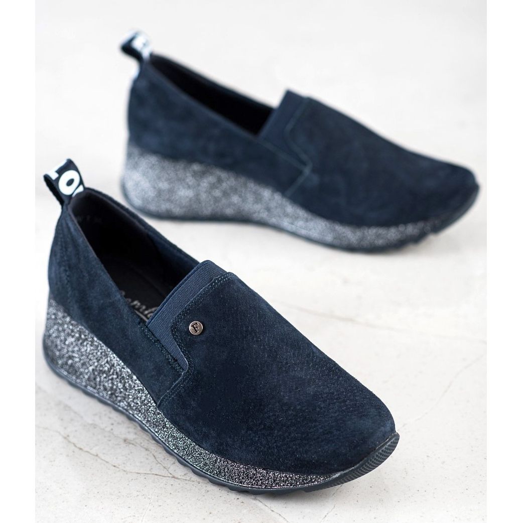 Gornjište izrađeno od visokokvalitetne tamnoplave prirodne kože ne samo da osigurava elegantan izgled, već i izdržljivost. Okrugli nos i blago podignuta prednja strana daju im svjež izgled, a fleksibilni gumeni umetak na zapešću čini njihovo nošenje pravim užitkom.