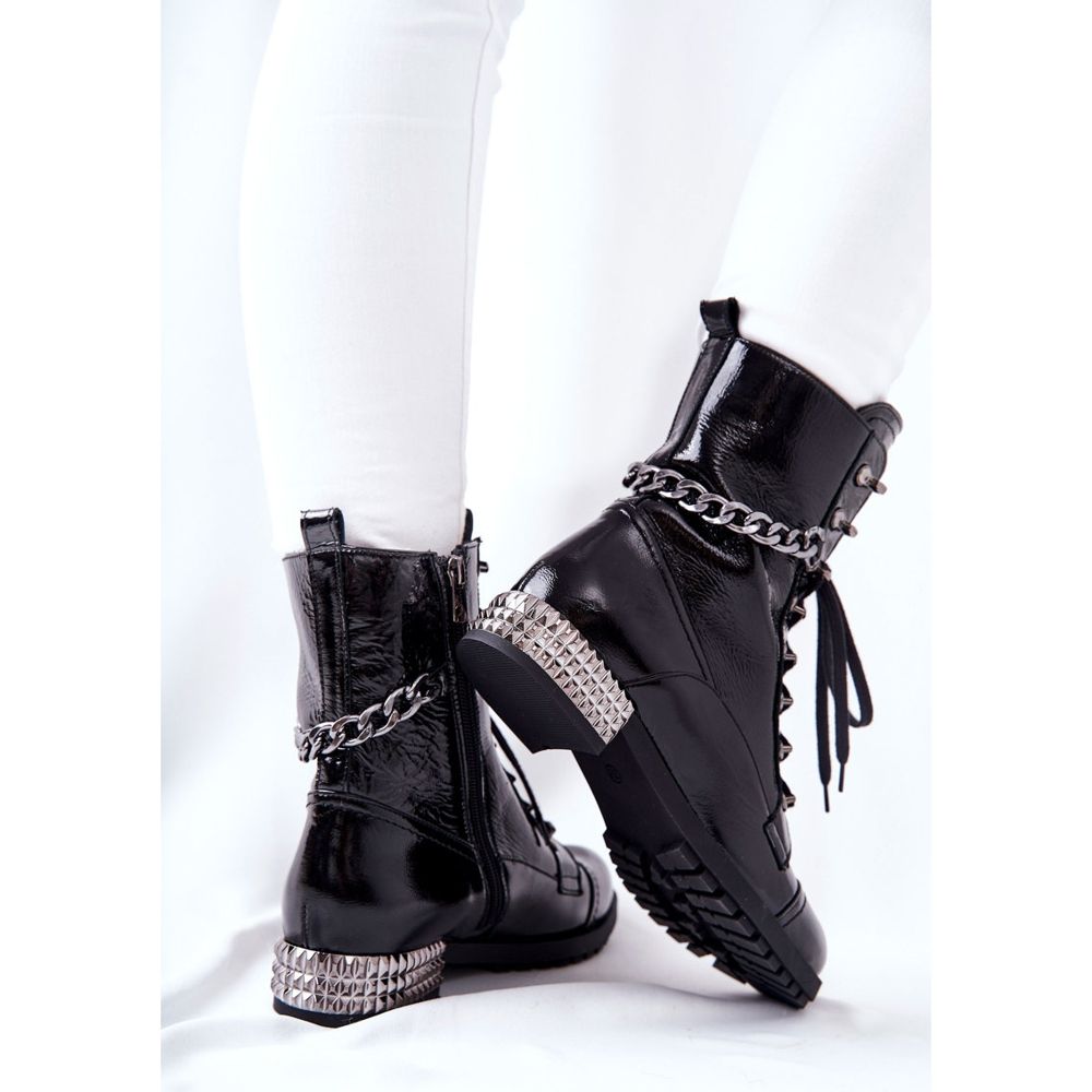 Prilikom dizajniranja ovih čizama vodilo se računa o svakom detalju. Opremljene patentnim zatvaračem i vezicama, omogućuju savršeno pristajanje uz nogu. Potpetica visoka 3 cm ukrašena nitnama i dodatni lančić na gornjem dijelu daju im originalan, oštar karakter po kojem ćete se sigurno istaknuti u masi.