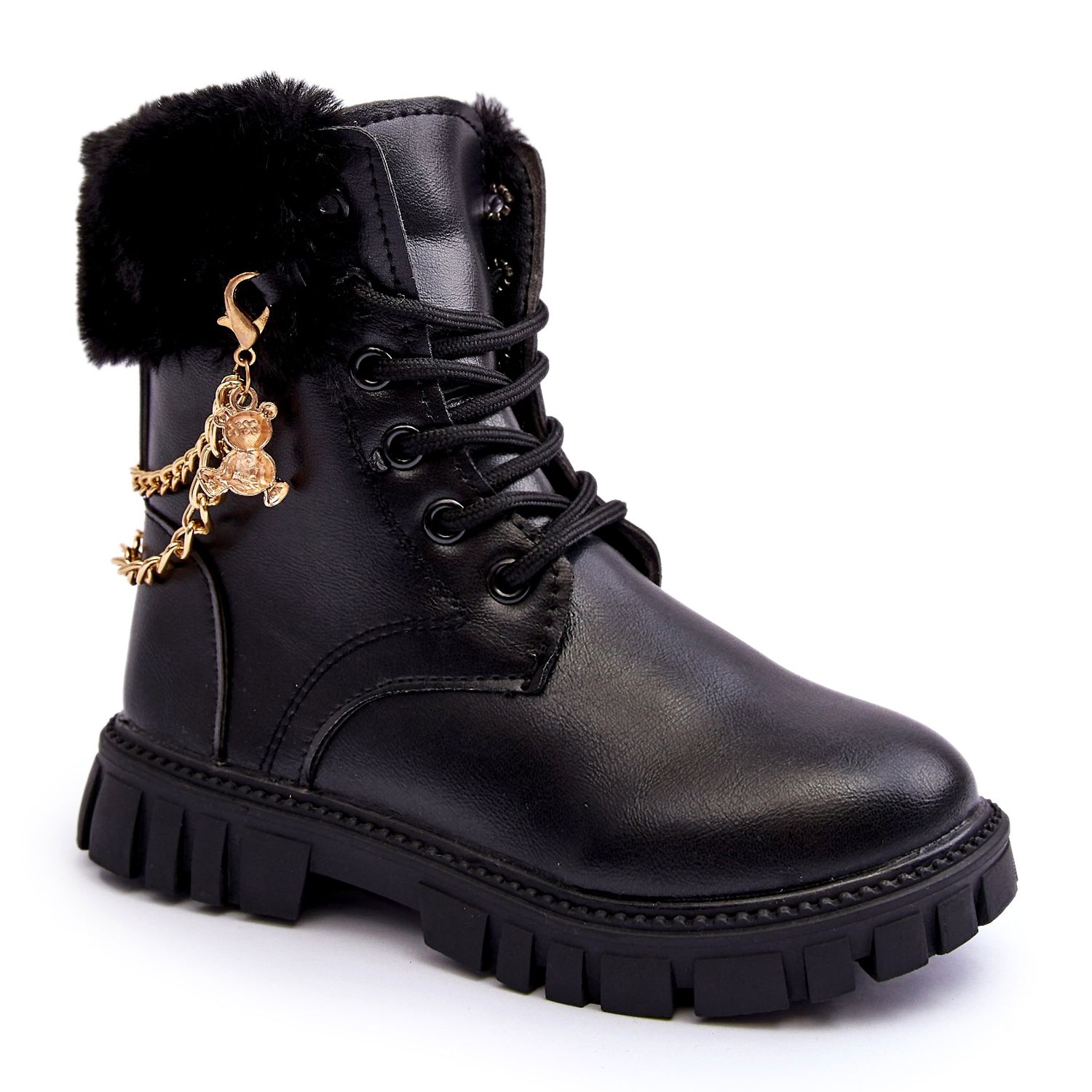 Kožne dječje čizme izolirane s crnim lancem crna