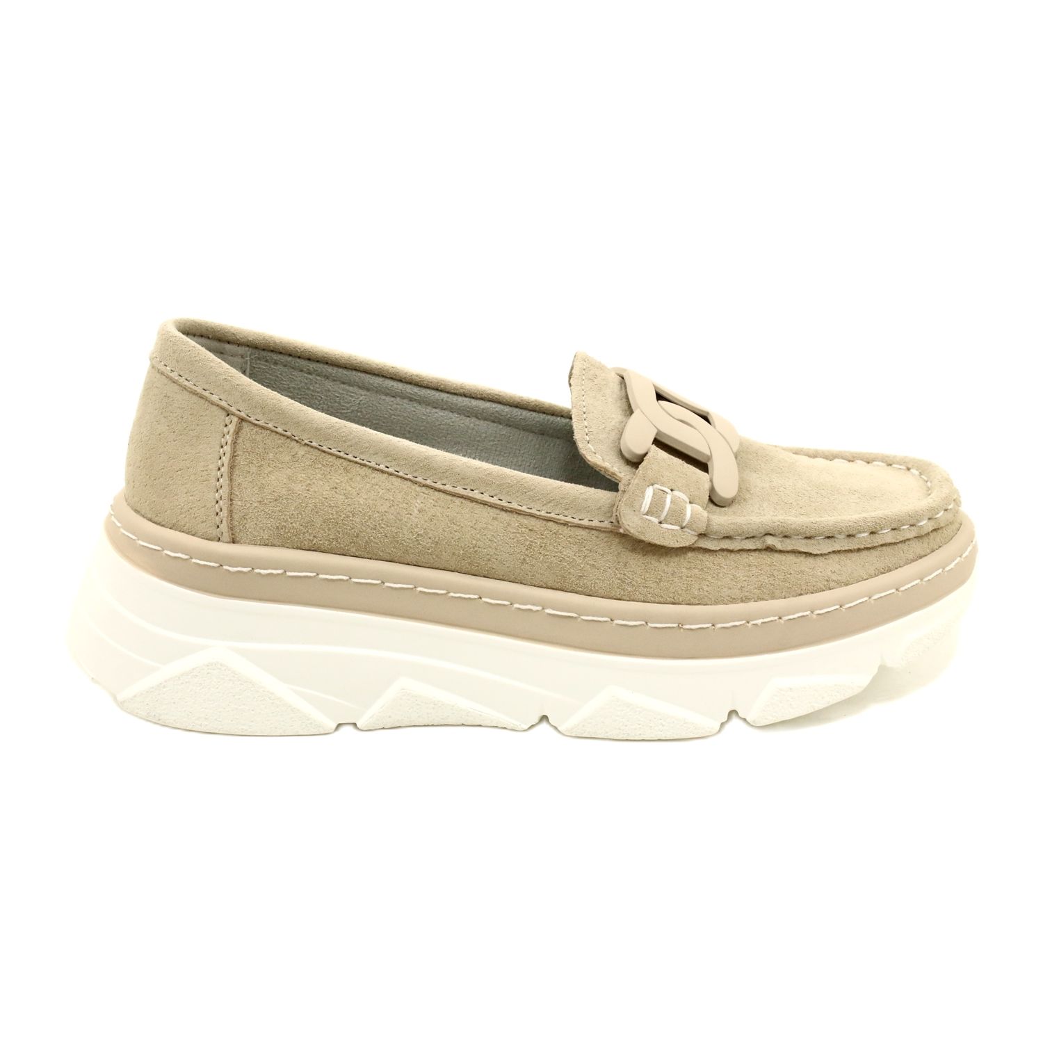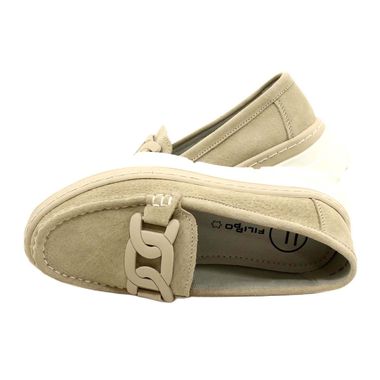 Jedinstveni dizajn mokasina ističe se delikatnim bež lancem koji im daje karakter i modernost. Deblji potplat, visine 5 centimetara, osigurava stabilnost pri hodu, a ujedno naglašava elegantan izgled cipela. Dodatno, unutarnji kožni umetak obložen mekom spužvom omogućuje udobno nošenje tijekom cijelog dana, što je posebno važno tijekom dugih šetnji.