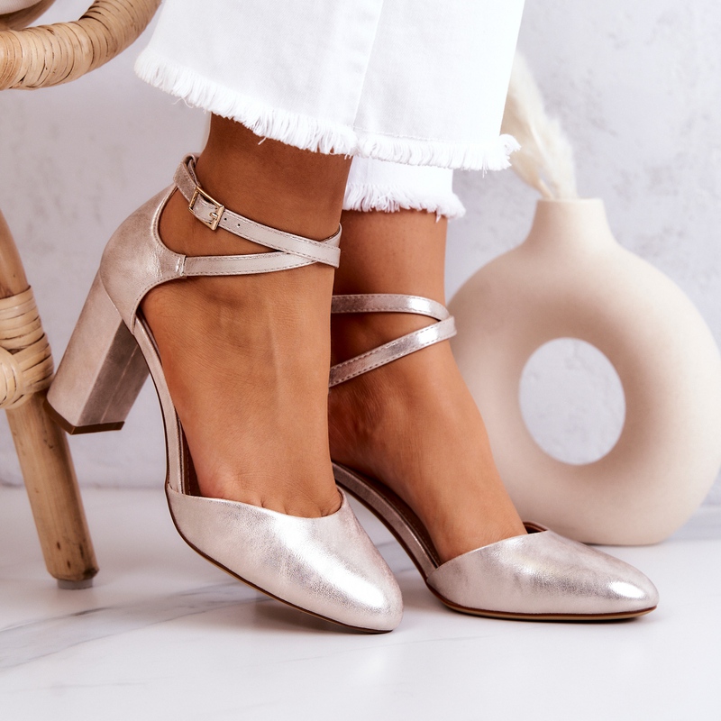 Otkrijte izvanredne kožne salonke na visoku petu Sergio Leone SK851 u elegantnoj zlatnoj boji koje će savršeno upotpuniti svaki ženski stajling. Izrađene od najkvalitetnije eko kože, spajaju stil i udobnost nošenja. Kopčanje na kopču s podesivim remenom jamči savršeno pristajanje uz nogu, a mekani uložak od prirodne kože čini da se vaša stopala osjećaju ugodno čak i nakon višesatnog hodanja.