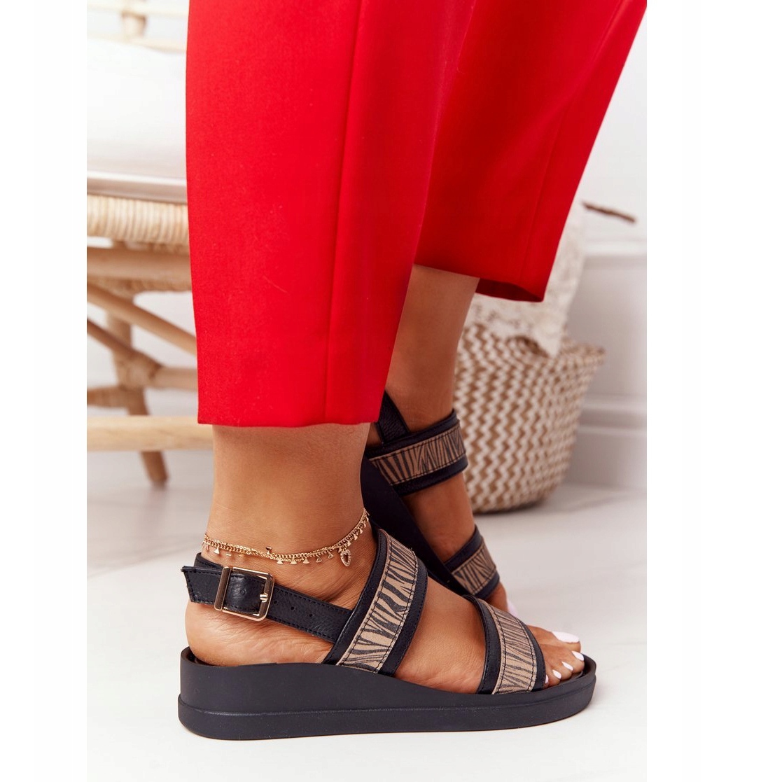 Klasičan rez s modernim motivom za životinje u bež i crnom tonu funkcionirat će i za svakodnevne i za više izlazne stililizacije - dobro se stapa s haljinama, suknjama i prozračnim hlačama. Pričvršćivanje kopča omogućuje vam da precizno uskladite sandale s stopalom, a otvoreni nožni prst dodaje ljetni lik.