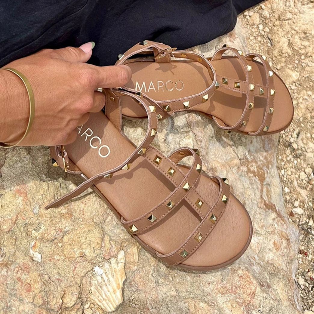 Marco Shoes sandale klasičnog su dizajna koji se lako kombiniraju uz razne stilove, a smeđa boja savršeno se uklapa u vašu ljetnu garderobu. Dodatni ukras u obliku zlatnih nitni daje im moderan karakter, a kopča savršeno prianja uz nogu.