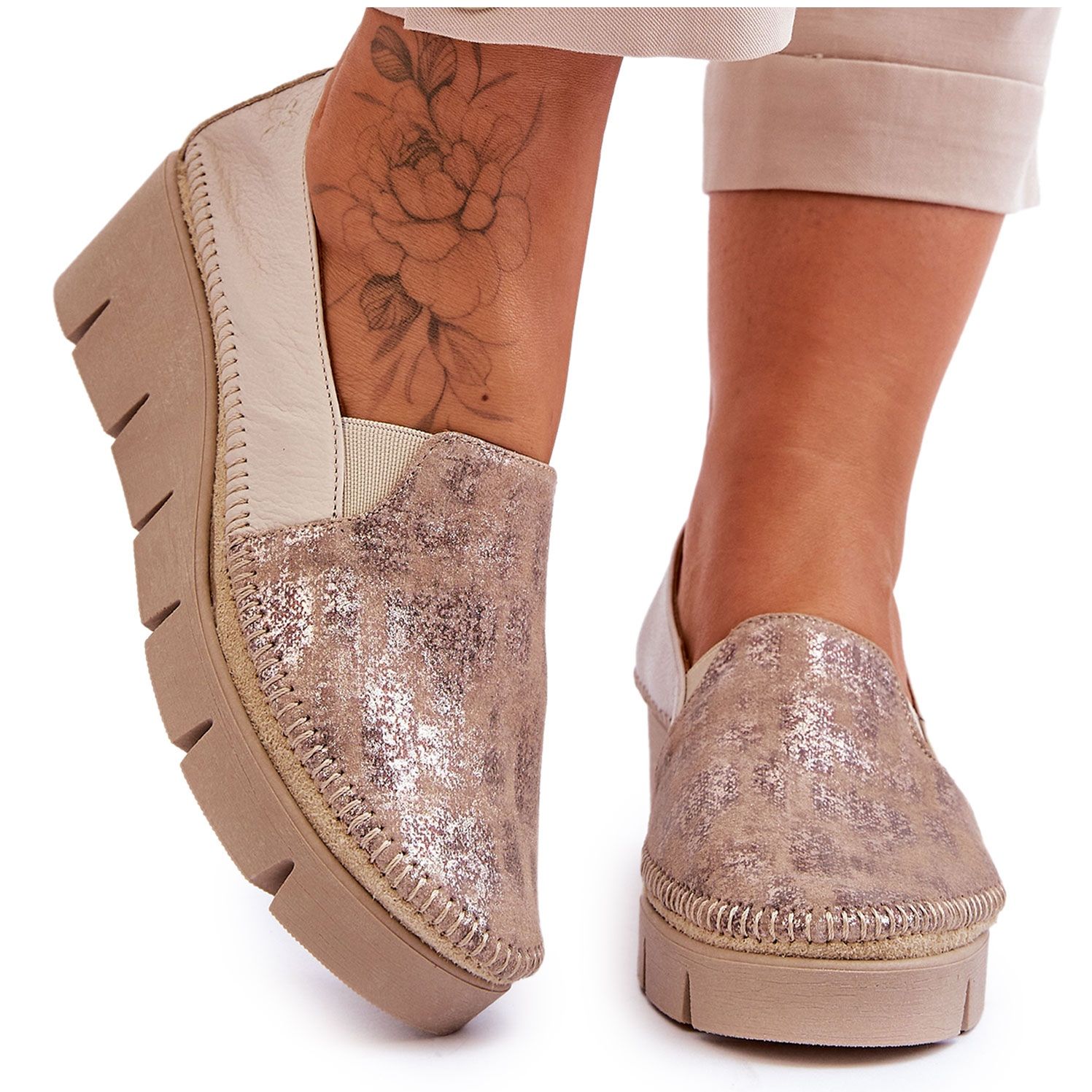 Klasične i istodobno moderne tenisice s Maciejkom izrađene od prirodne kože. Postavljeni na osjetljivu platformu i stabilan klin, oni kombiniraju udobnost nošenja s suptilnom sesijom figure. Savršeno za proljetnu/ljetnu sezonu - praktično, elegantno i univerzalno.