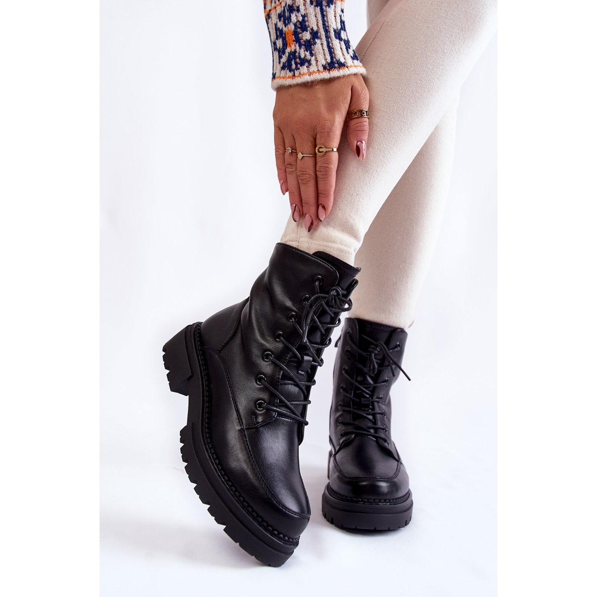 Čizme su izolirane mekom dekicom za obuću, što ih čini savršenim izborom za hladnije dane. Zahvaljujući patentnom zatvaraču i gornjem dijelu na vezanje, lako se obuvaju i savršeno pristaju uz nogu. Ravna peta visine 4,5 cm i platforma s utorima osiguravaju udobnost nošenja, a ukrućena potpetica naglašava stabilnost.
