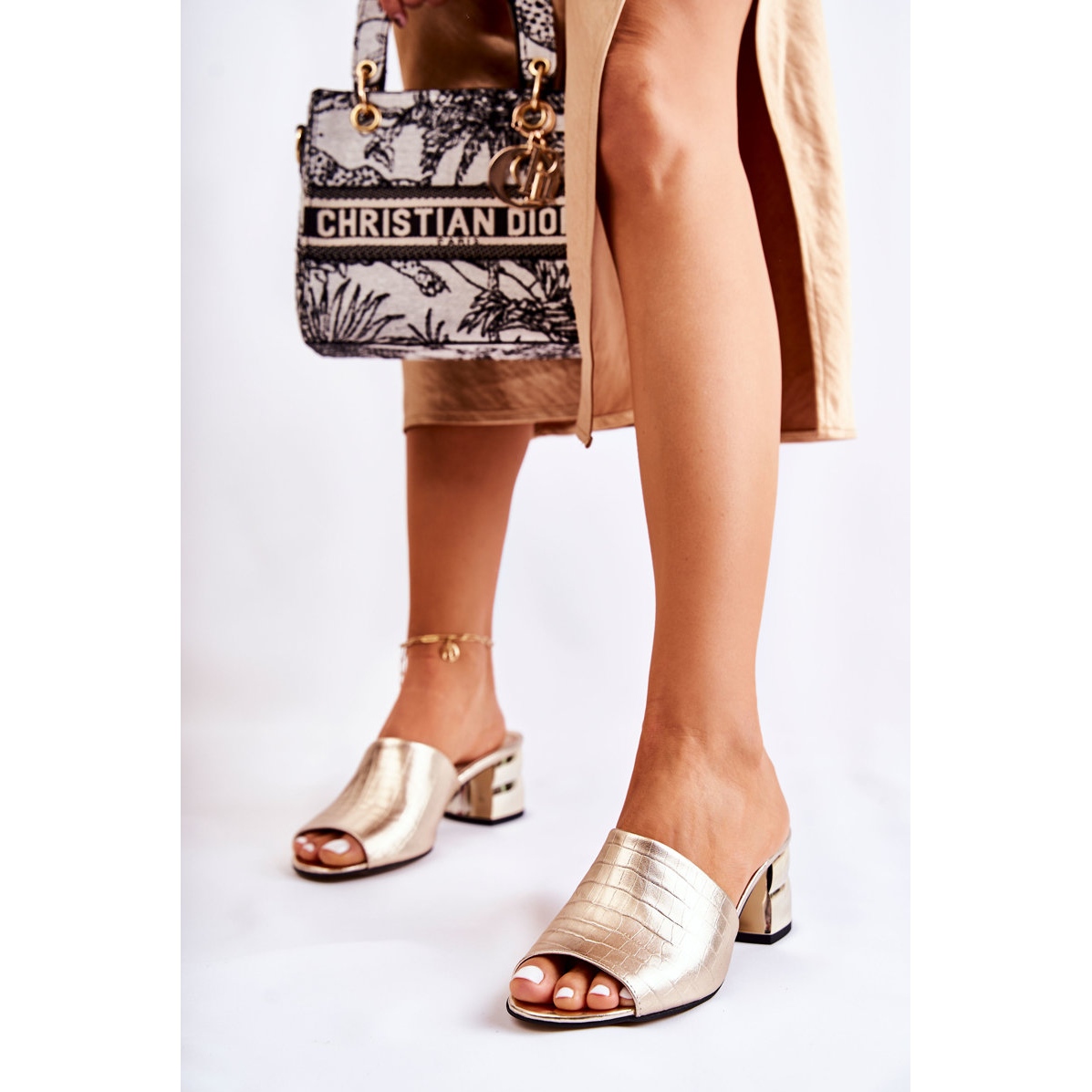 Detalji: PA2 Kožne ženske papuče krokodil uzorak na petu Golden Perry zlatna