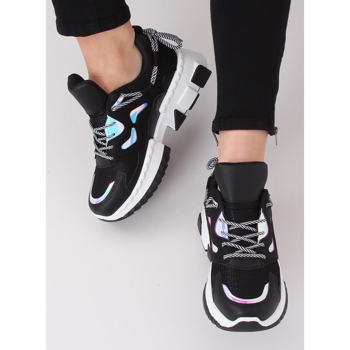 Otkrijte nevjerojatne sportske cipele LA67P Black koje su nezaobilazan dio ženskih modela ove sezone! Ove originalne cipele impresioniraju svojim masivnim, ultramodernim potplatom, koji ne samo da pruža udobnost, već i dodaje karakter svakom stajlingu. Crni završetak savršeno pristaje uz holografske umetke koji privlače pozornost, a šarmantna mašna s vezicama na leđima dodaje lakoću i djevojački šarm.