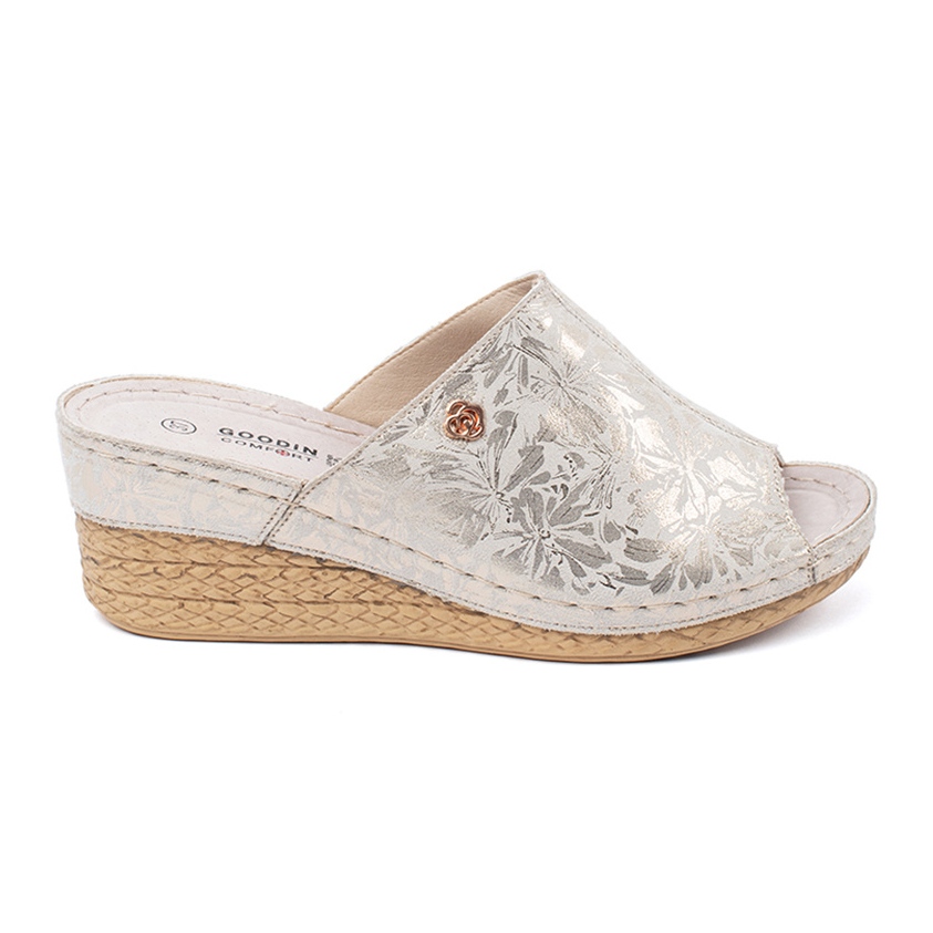 Evo laganih bež ženskih klinova iz poznate marke Goodin, koji kombiniraju eleganciju s udobnošću. Njihova otvorena peta i umetnuta kopča čine ih izuzetno jednostavnim za stavljanje i skidanje. Visina pete od 5,5 cm dodaje suptilan šarm, savršeno naglašavajući svaku stilizaciju bez odustajanja od udobnosti.