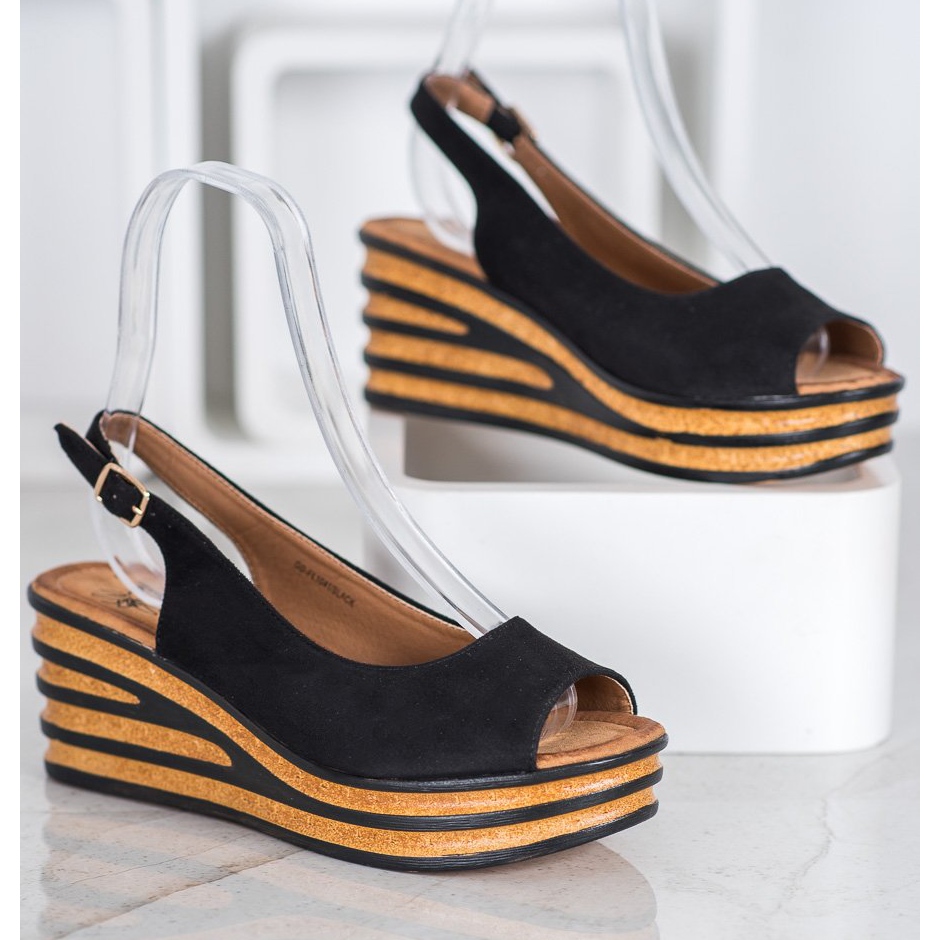 Otkrijte eleganciju i udobnost uz Goodin's crne ženske sandale koje su savršen izbor za proljetne i ljetne dane. Izrađene od visokokvalitetnog materijala koji imitira antilop, ove sandale spajaju moderan dizajn i funkcionalnost. Zahvaljujući dvobojnim wedgesima visine 7,5 cm koji optički izdužuju noge, svaki će korak biti pun stila i samopouzdanja.