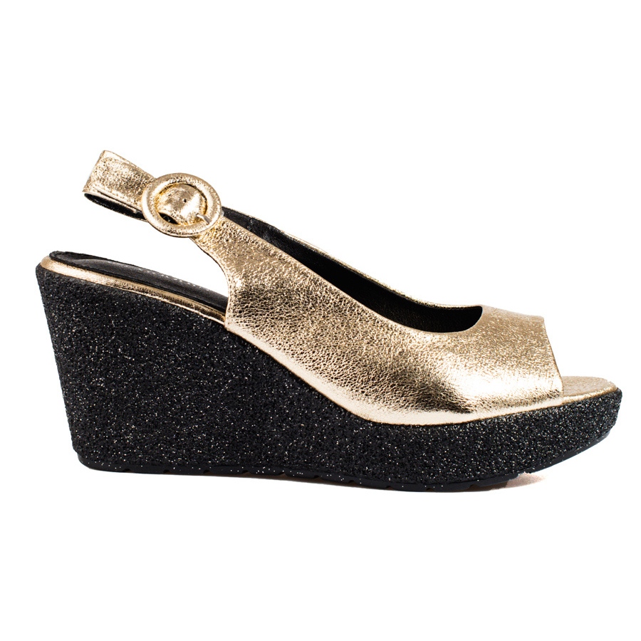 Otkrijte jedinstvenu eleganciju s laganim Shelovet ženskim sandalama na klin u blještavom zlatu. Ove sandale savršen su odabir za mnoge prilike - od večernjih zabava, preko proslava, do svakodnevnih stajlinga. Zahvaljujući klasičnom kroju, koji se diže na klin od 8 centimetara i platformu od 2,5 centimetara, pružaju ne samo moderan izgled, već i udobnost nošenja.