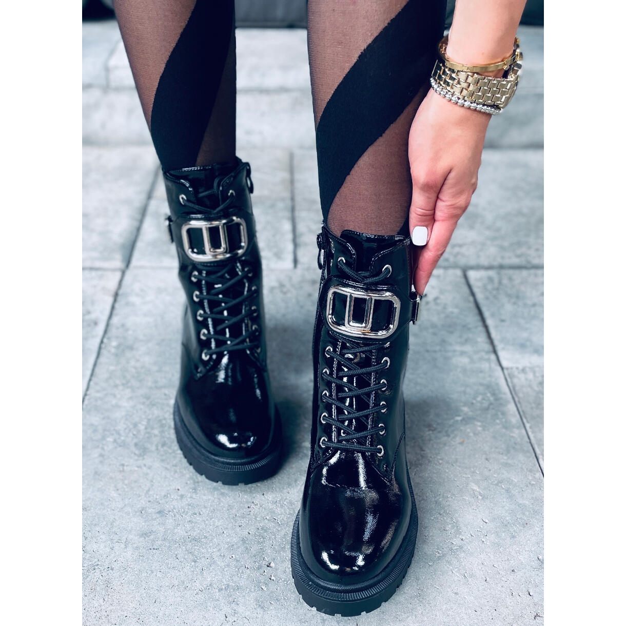 Lakane gležnjače Mila PATENT (BLACK) savršen su izbor za moderne žene koje cijene stil u kombinaciji s udobnošću. Ove elegantne radničke cipele s visokim potplatom odlikuju se klasičnim dizajnom i najmodernijim lakiranim završetkom koji im daje jedinstven karakter. Upečatljivi srebrni detalj u obliku ukrasa dodaje chic cijeloj stvari garantirajući WOW efekt svaki dan!