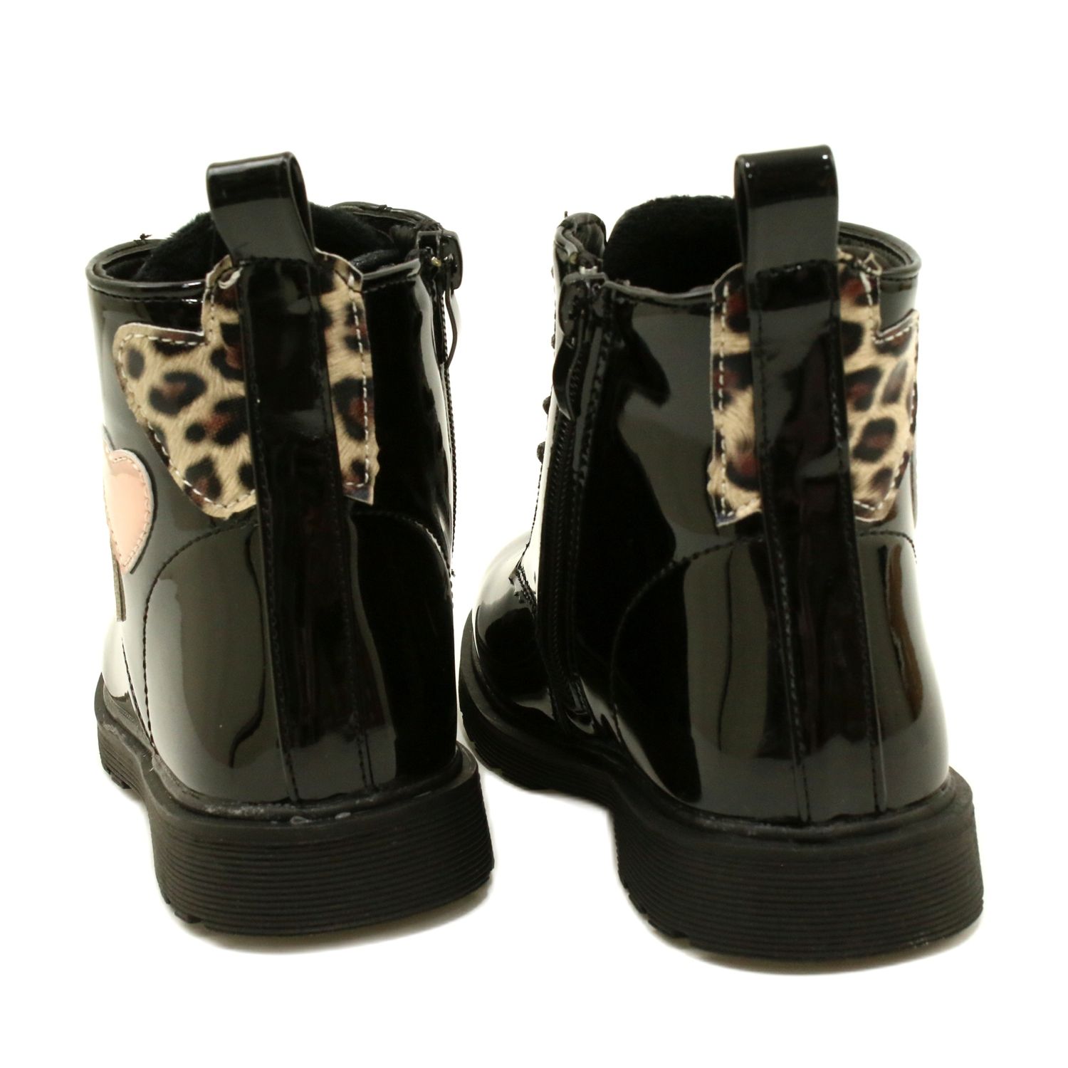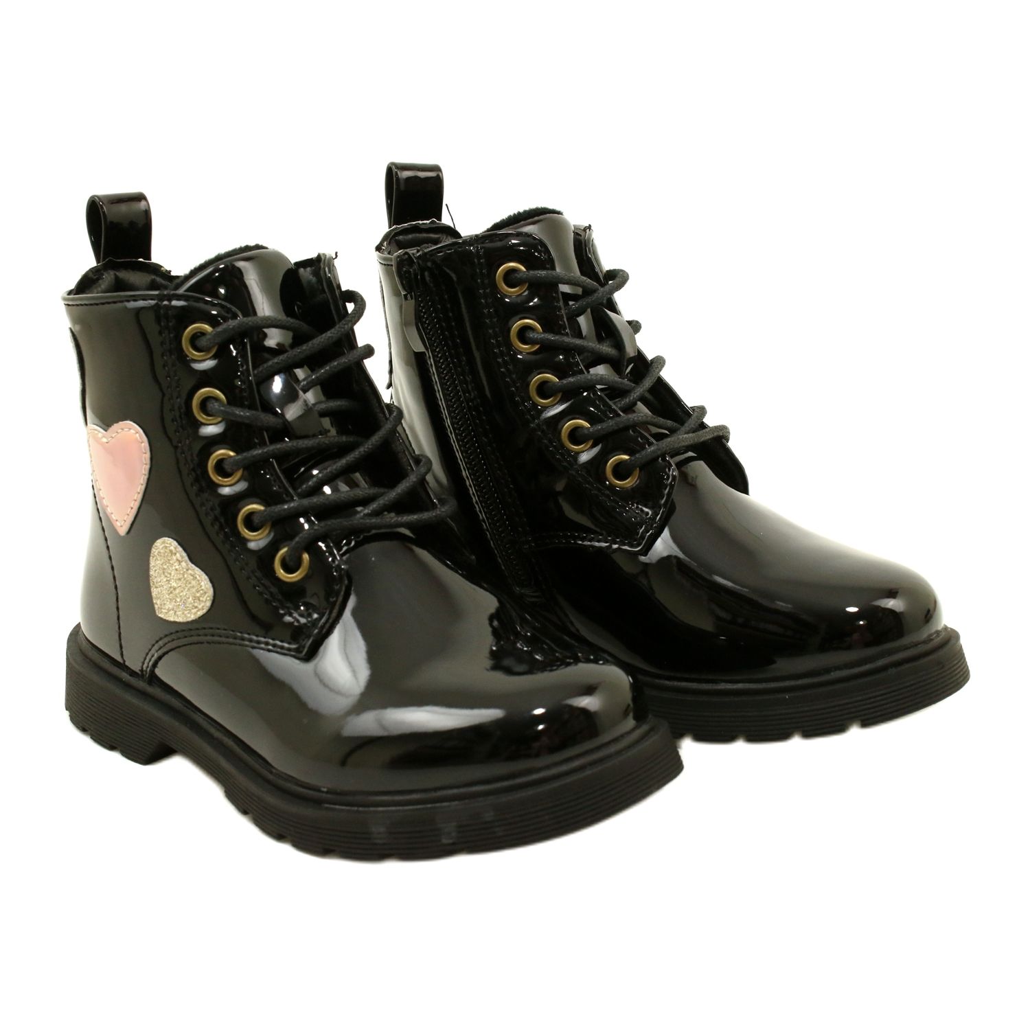 Elegantne gospođice čizme izrađene od lakirane ekološke kože u klasičnoj crnoj boji. Unutrašnjost i umetnuti izolirani mekim krznom obuće, zahvaljujući koje cipele pružaju udobnost i toplinu u hladnijim danima. Dekorativna srca na vanjskom gornjem dijelu zlatnog naglaska daju im djevojački karakter i originalnost.