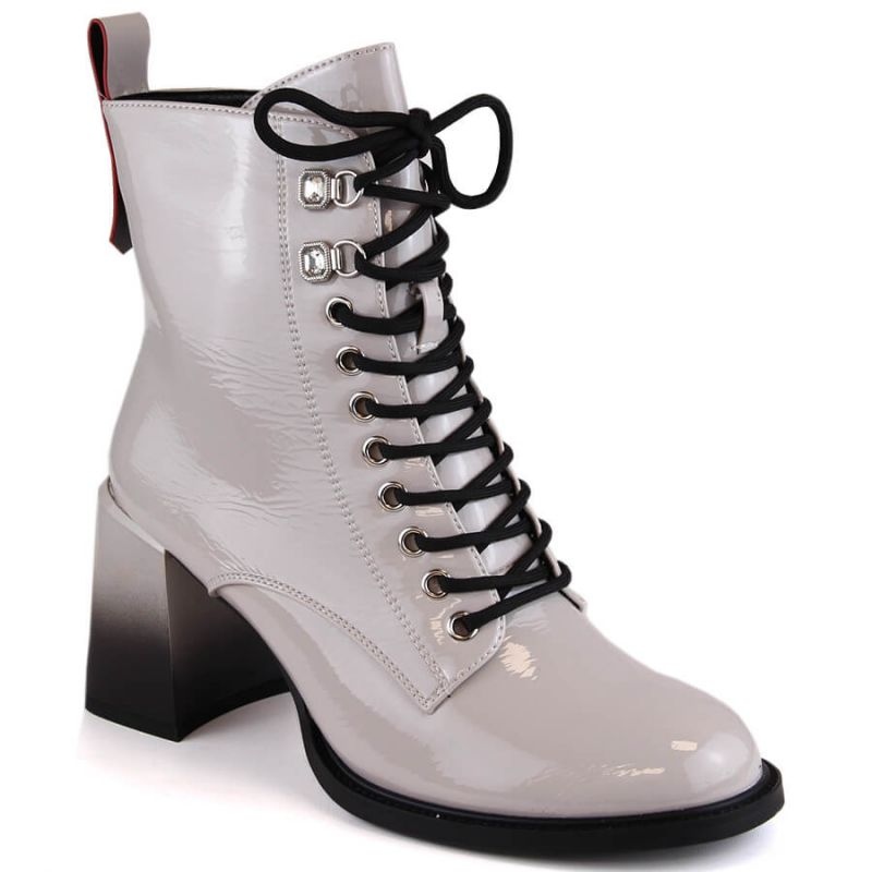 Elegantne i praktične čizme koje svakodnevno kombiniraju žensku eleganciju s utjehom. Lakirani gornji dio ekološke kože daje im moderan karakter, a izolirana obloga "pokrivač" pruža udobnost u hladnijim danima. Stabilna peta od 8 cm naglašava lik, a pričvršćivanje na patentni zatvarač i čipke omogućava savršeno uklapanje.