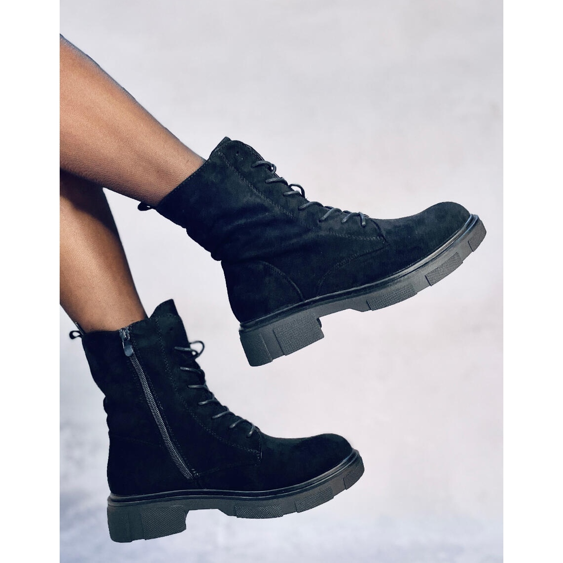 Elegantne, crne ženske čizme, izrađene od ekološke antilop. Ovo je univerzalni model svaki dan - ugodan, topao i lako u skladu zahvaljujući tradicionalnom vezanje i praktičnom bočnom dvorcu.