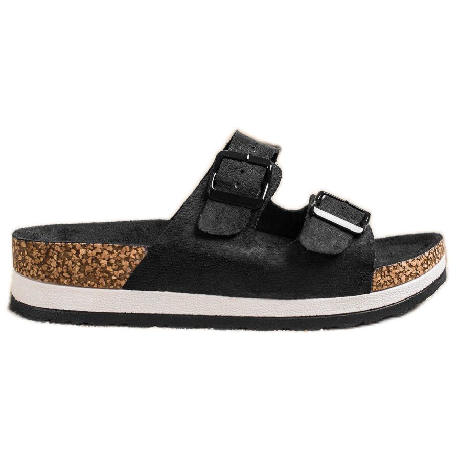 Obuća nema potpeticu, što je čini izuzetno laganom i ugodnom za korištenje. Otvorena peta i kopča daju im moderan karakter, a sintetički potplat s gazištem pruža izvrsno prianjanje tijekom svakodnevnih šetnji. Platforma visoka 4 cm ne samo da povećava udobnost, već i optički izdužuje noge.